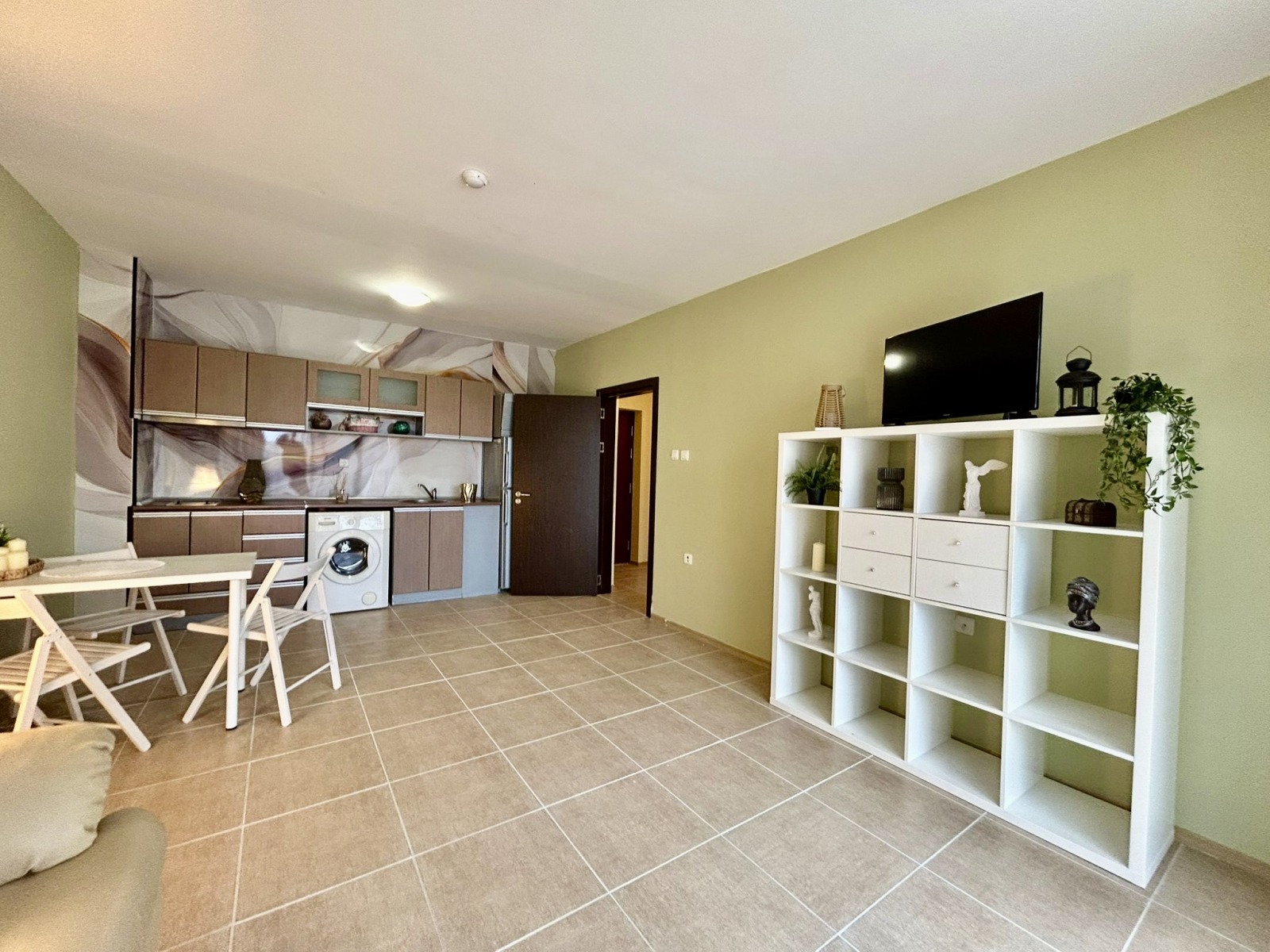 Предлагаме за продажба обзаведен двустаен апартамент в комплекс Аполон 7 , стилен апарт-комплекс, разположен в тих и спокоен район, само на 150 м. от плажа Аурелия , едно от най-живописните места по българското Черноморие, така наречения Залив на потъналия кораб. Апартаментът е с квадратура 65 кв.м. и се намира на втори жилищен етаж. Разпределение: просторна дневна с оборудван кухненски бокс, кът за хранене и зона за отдих, спалня, баня с тоалетна , тераса. Апартаментът се продава напълно обзаведен и оборудван, готов за нанасяне. Комплексът е с отлично поддържана просторна озеленена територия, предлага открит плувен басейн с детска секция, джакузи, детска площадка, собствен паркинг, ресторант, дневен бар и супермаркет, с възможност за ползване на тенис корт , спортно игрище и спа център. Комплексът е с целогодишно управление - денонощна охрана, видеонаблюдение, почистване, техническа поддръжка, ограничен достъп. С Акт 16 и Разрешение за ползване. Прекрасно място за почивка и семеен отдих, съчетаващо близостта до морето и тази до Стария Несебър, Районът е с добра инфраструктура, комуникации и удобен автобусен транспорт. Апартаментът е изключително подходящ за живеене и отдаване под наем целогодишно.