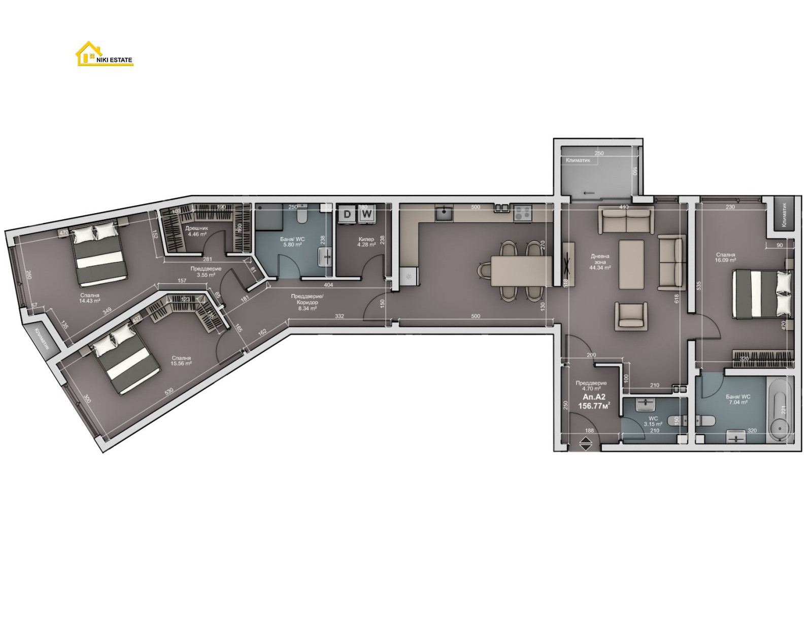 Напълно обзаведен с дизайнерски проект с висок клас електроуреди на Бош ,климатици Мицубиши и мебели от Турция.