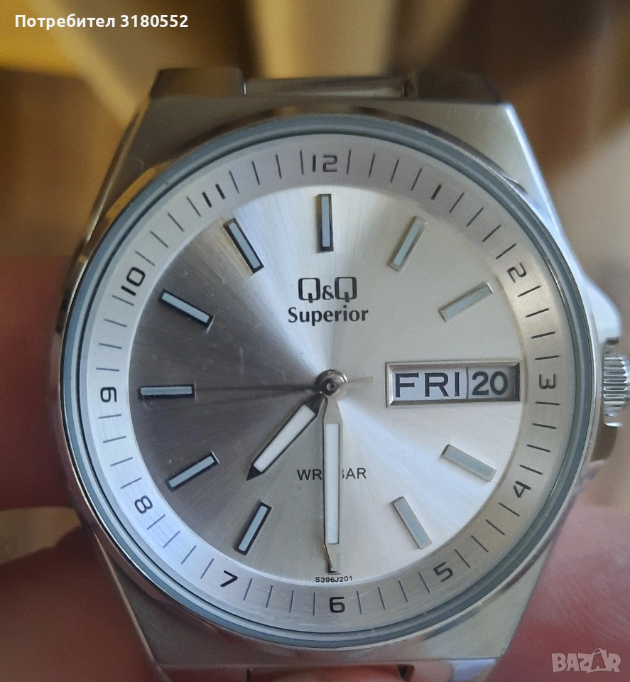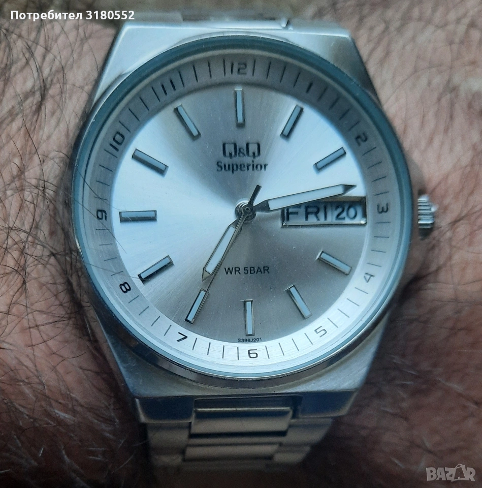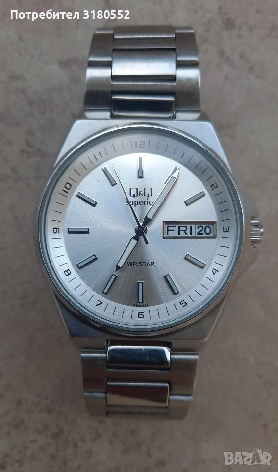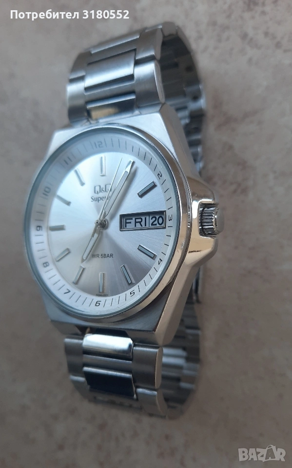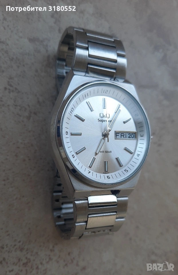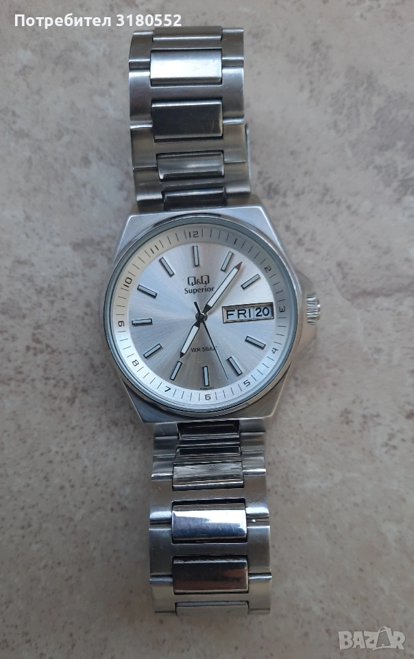 Продавам мъжки ръчен часовник Q& Q Superior, water resistant, All stainless steel. Qartz. Масивен, каса и ланец-от неръждаема стомана са. Водоустойчив. С фосфориращи стрелки. Малка ползван, неразличим от нов - видно и от снимките. Точен е. За повече инфо - по телефона.