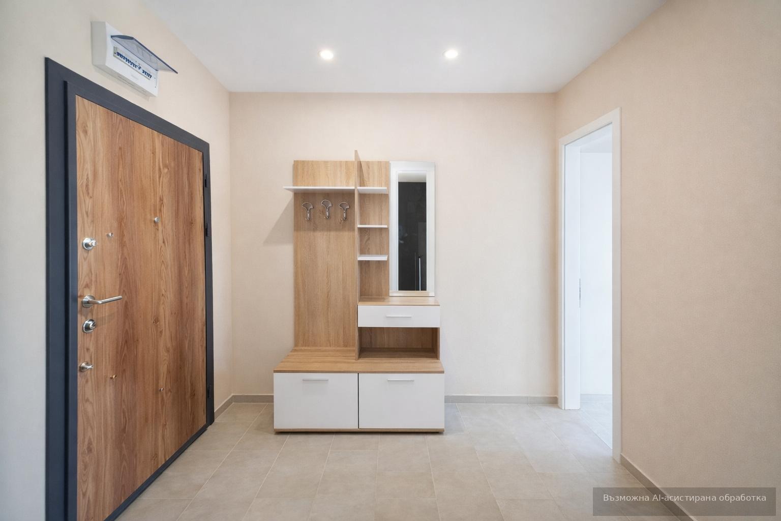 Разполага с площ 70кв.м и се състои от: входно антре, хол с кухненски бокс и трапезария, спалня, баня с тоалетна и тераса.