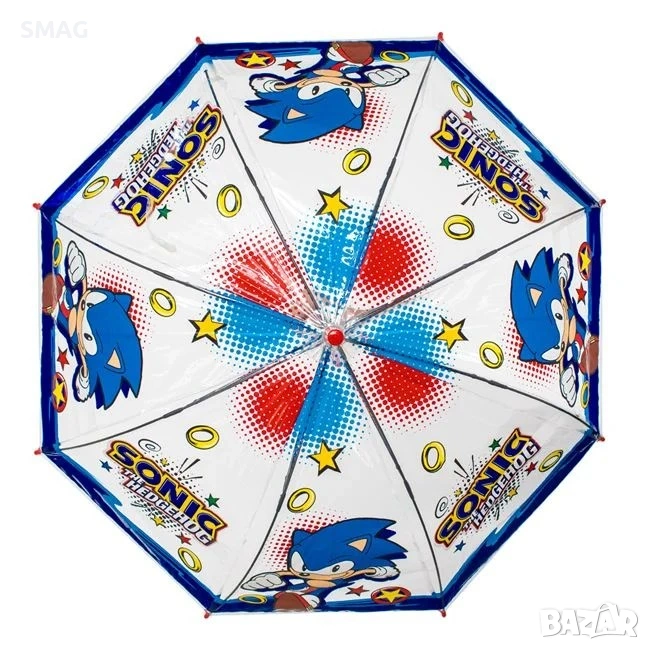 Детски чадър за дъжд в прозрачен син цвят с "Sonic" дизайн. Има синя дръжка и самоотварящ се механизъм. Дължина: 64 см, диаметър в отворена позиция: 73 см. Задължителен аксесоар за деца в дъждовни дни!