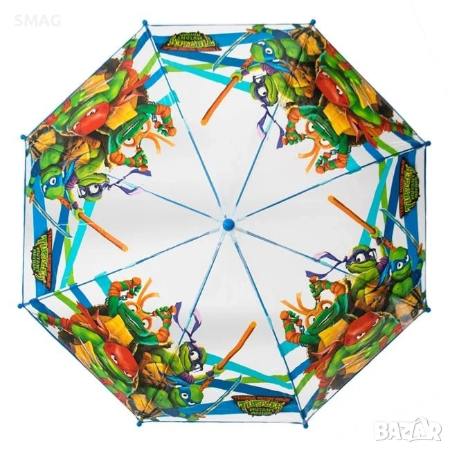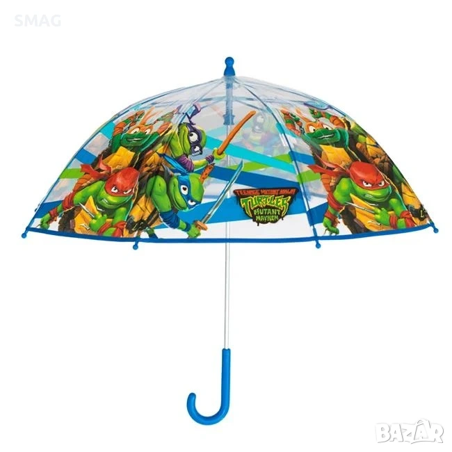 Детски чадър за дъжд с прозрачен материал в син и зелен цвят с дизайн Ninja Turtles. Оборудван с извита дръжка и ръчен механизъм за отваряне. Дължина: 64 см, диаметър в отворено състояние: 72 см. Незаменим аксесоар за децата в дъждовните дни!