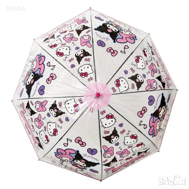 Детски чадър за момиче в цикламен прозрачен цвят с дизайн Hello Kitty & Kuromi. Оборудван с цикламена дръжка с извита ръкохватка и механизъм за автоматично отваряне. Дължина: 82 см, диаметър в отворено положение: 89 см. Незаменим аксесоар за децата в дъждовните дни!