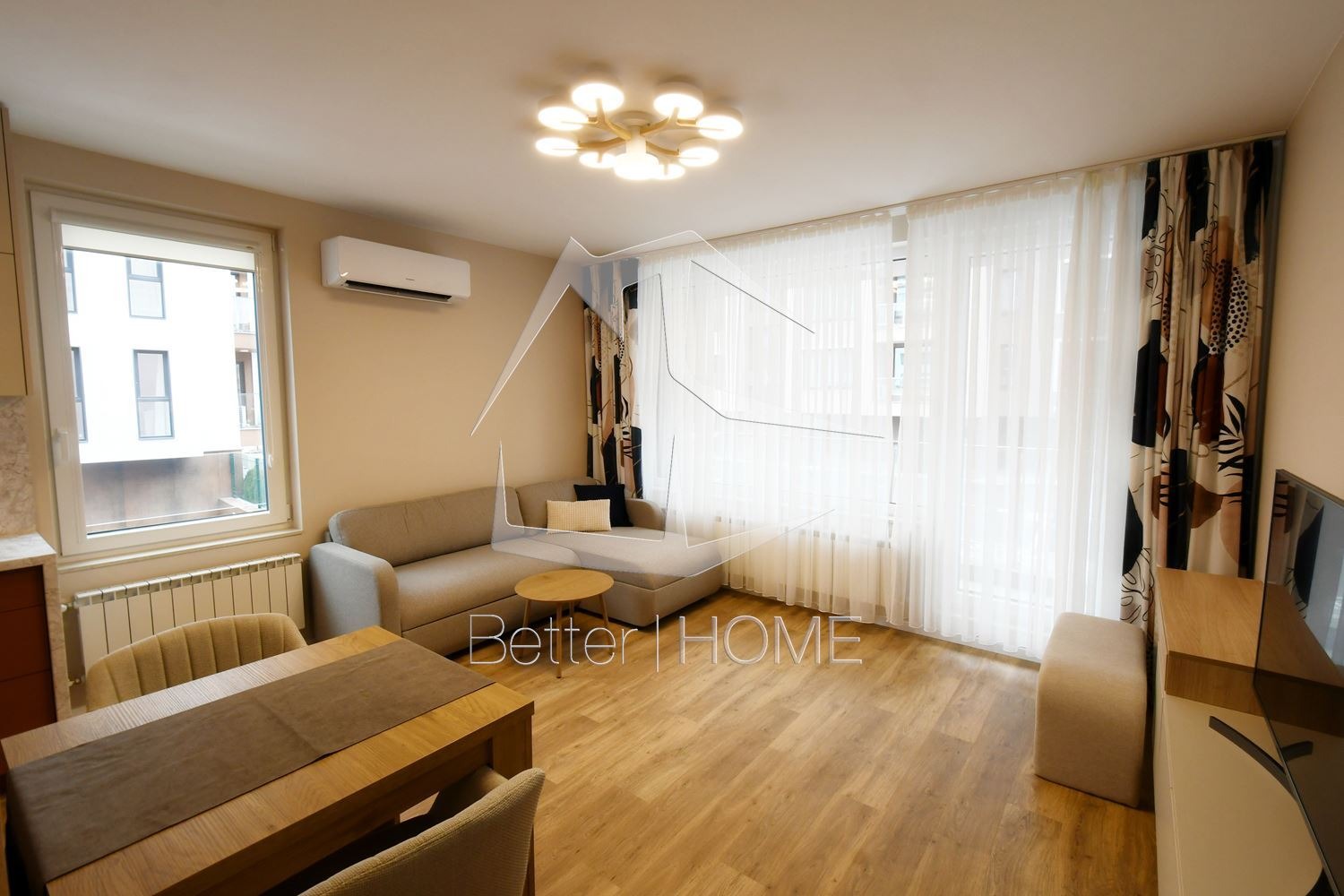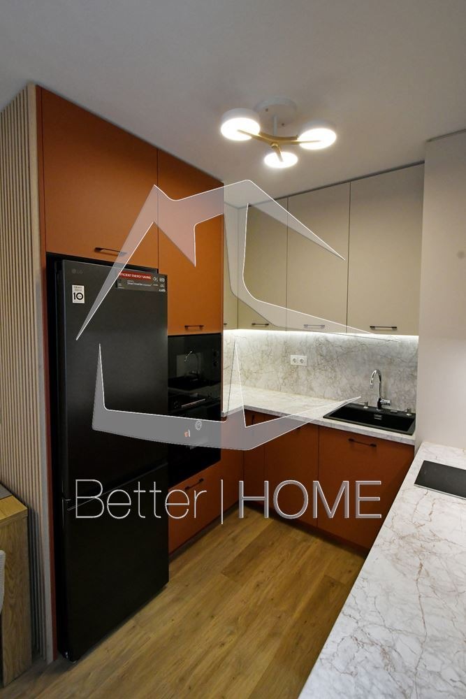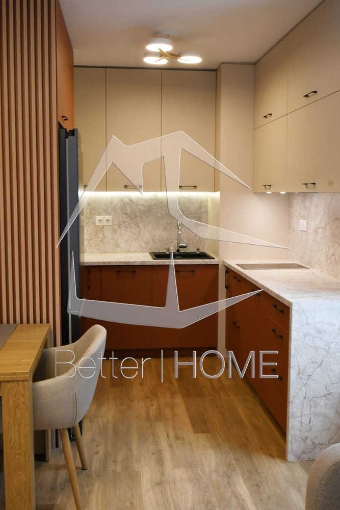 Интериорът е изпълнен в съвременен стил с висококачествени материали, естествени дървесни тонове и неутрална цветова гама. Кухнята е напълно оборудвана с вградени електроуреди хладилник, фурна, котлони, абсорбатор и съдомиялна. В дневната има комфортен диван, маса за хранене и TV шкаф. Спалнята е обзаведена с удобно легло и и голям гардероб