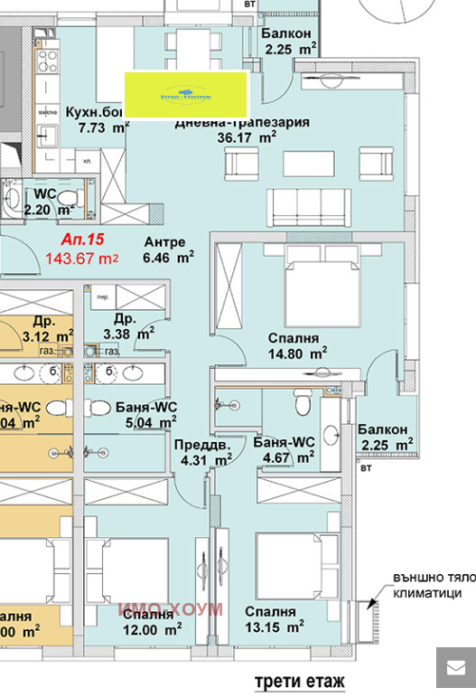 Агенцията предлага и друг 4-стаен апаратманет в сградата на партер със застроена площ от 136,34 кв.м. и прилежащ двор 210кв.м на цена от 445 000