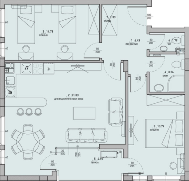Жилището се намира на първи надпартерен етаж. Има следното разпределение: антре-6.43м2, склад-1.33м2, баня с тоалетна-3.76м2, тоалетна-1.79м2, спалня-14.78м2, спалня-13.79м2, дневна с кухненски бокс-31.83м2 и тераса-4.95м2. Изложението му е Юг/Изток.