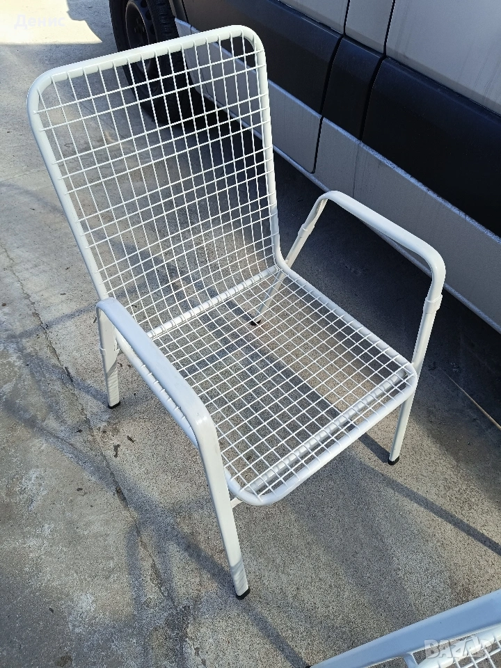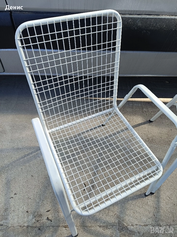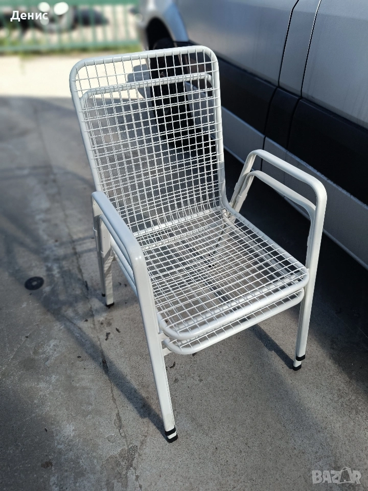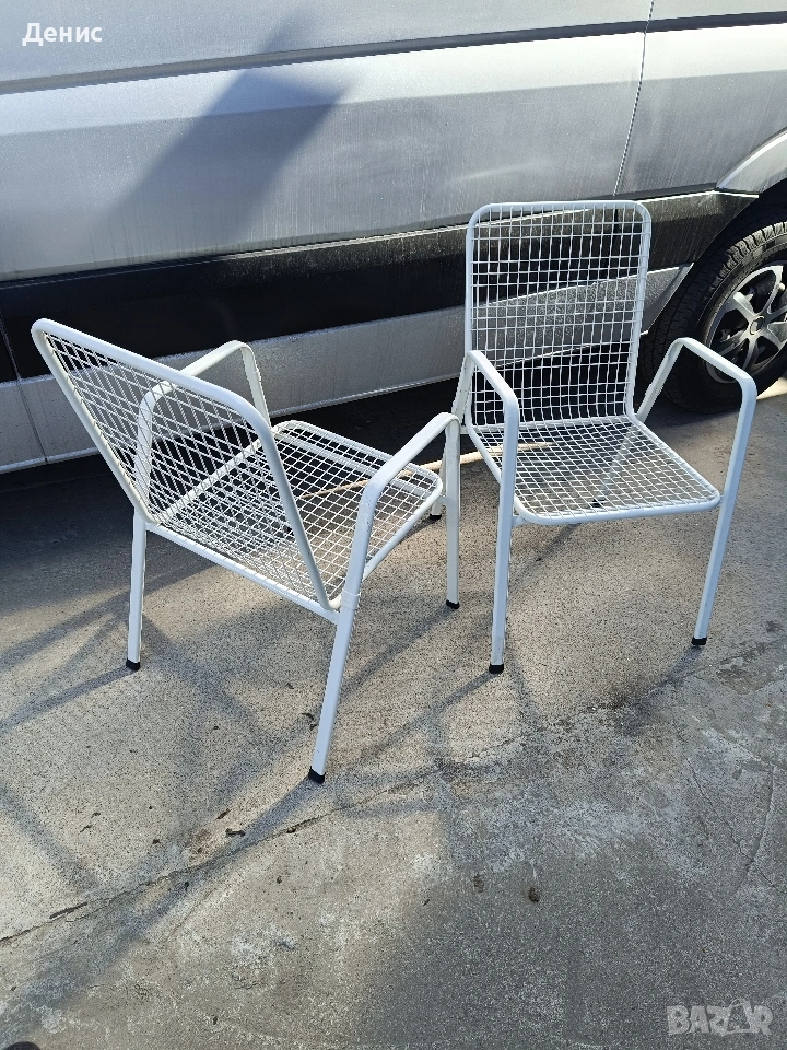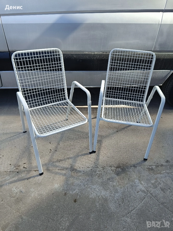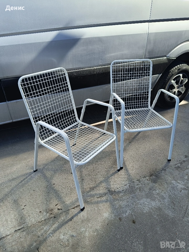 Метални градински столове – Made in Germany Продавам комплект от 2 стабилни метални градински стола, произведени в Германия. Изработени са от прахово боядисана стомана в бял цвят, с елегантен и изчистен дизайн. Подходящи са за градина, тераса, двор или заведение. - Устойчиви на атмосферни условия - Ергономични подлакътници за повече удобство - Лесни за поддръжка и почистване и могат да ви служат за дълги години.Дори ще забравите,кога сте ги закупили. Състояние: Ползвани,но много запазени и удобни. Издръжливост до 150кг. За повече комфорт,може да се ползват със столови постелки. 💰 Цена: за двата броя 70€ Столовете в цвят кафяв,не се продават за сега,показвам стикера на производителя. Изпращам за цялата страна с куриер. При интерес съм на разположение на лично.