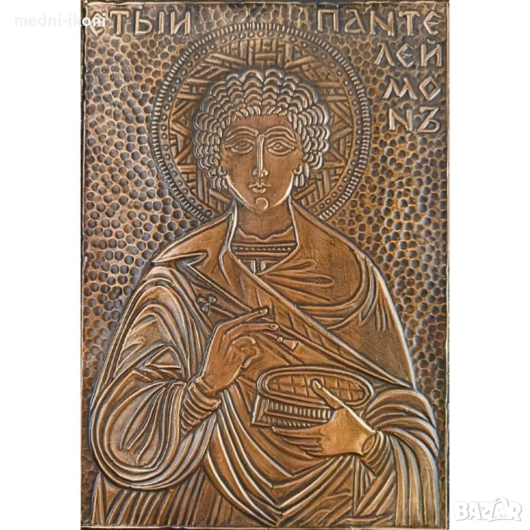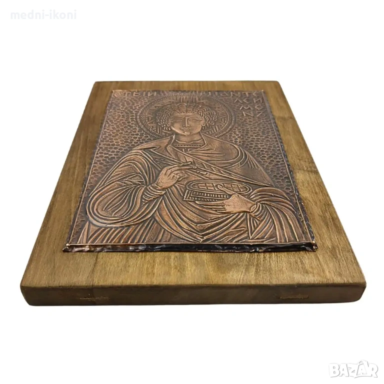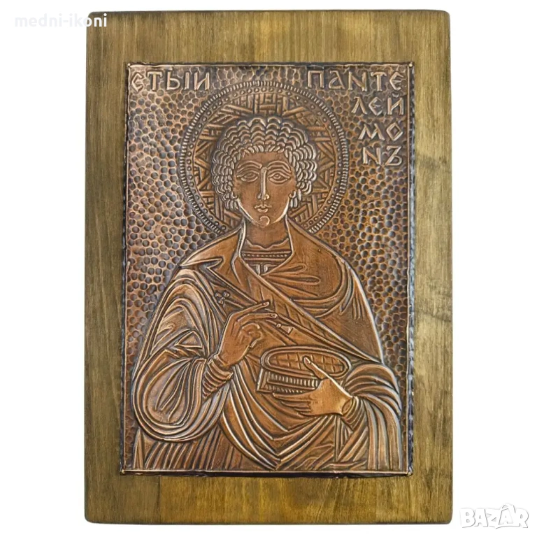 е върху дъска от липа, която е байцвана в цвят "орех". Тази икона е художествена репродукция на средновековна православна икона. На нея е изобразен Свети Панталеймон, учил е медицина и е бил придворен лекар. Отказал е да се поклони на езическите богове, заради което бил подложен на страдания, които изтърпял без болка с помощта на Христа. Празника му честваме на 27 юли. Смята се за покровител на семейството, лекарите и акушерите. Подходящ подарък е за сватба, нов дом, кръщене, за лекари, акушери и за семейство. Всяка една икона е уникат, притежава сертификат за автентичност, не е културна ценност и може да бъде изнасяна извън страната.