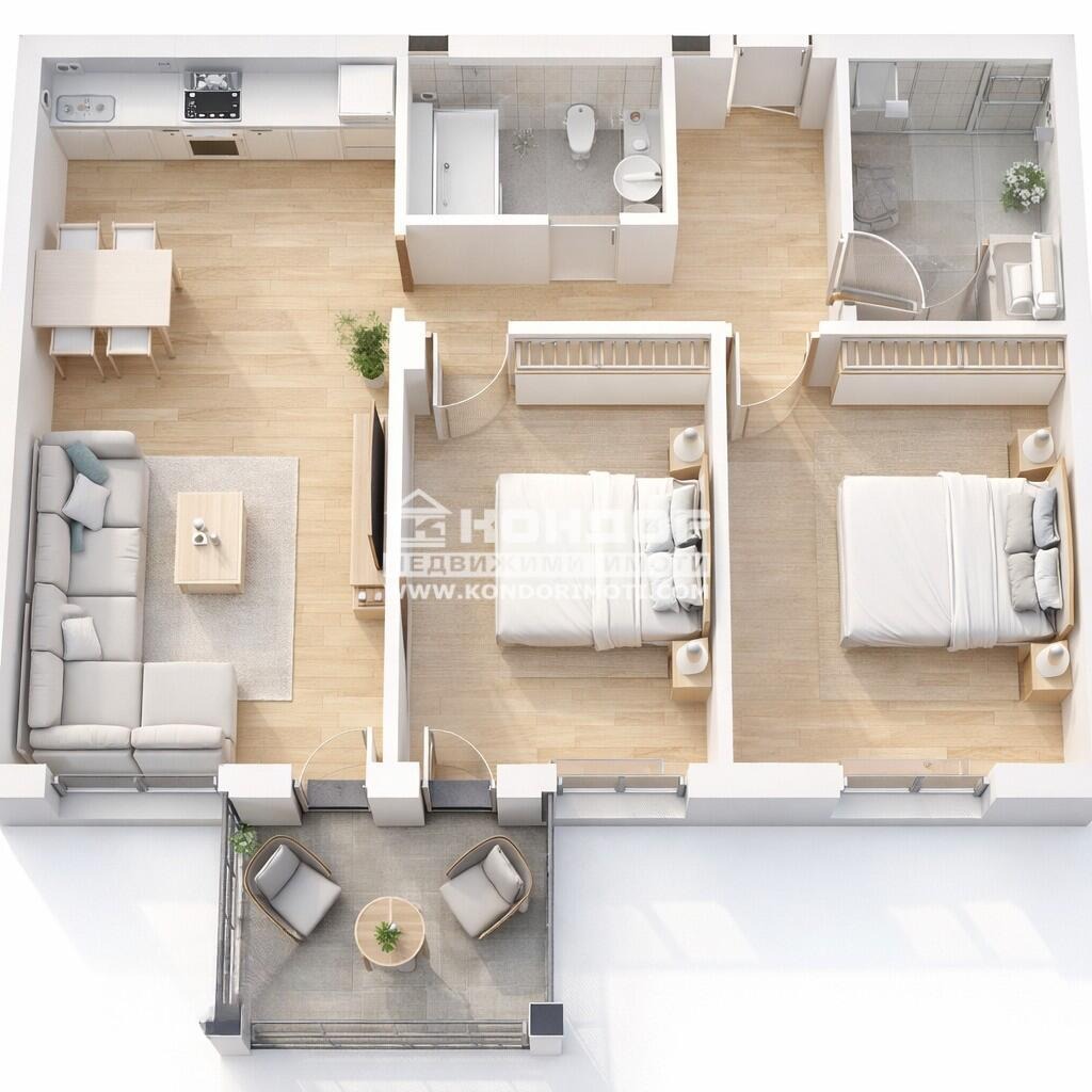 Оферта 67772 - Просторен тристаен южен апартамент в малка сграда, разположена в зелена и тиха зона с ниско застрояване, с добра локация и невероятна ЮЖНА панорамна гледка към Родопите. Близо до основни пътни артерии, магазини, детска градина, училище и паркове. Жилището се състои от дневна с трапезария и кухненска част - 28 кв.м., две самостоятелни спални по 13кв.м., две бани с тоалетна, входно антре и една тераса.