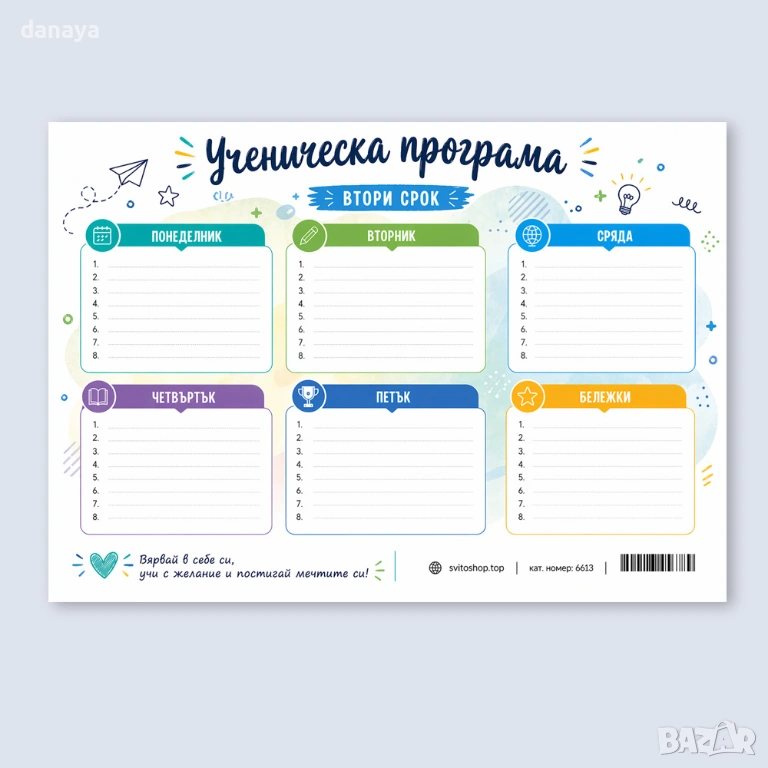 Всяка седмица е подредена интуитивно – от понеделник до петък, с номерирани часове от 1 до 8, така че попълването става за секунди. Добавеното поле за бележки помага да не се пропускат важни задачи, домашни или напомняния.