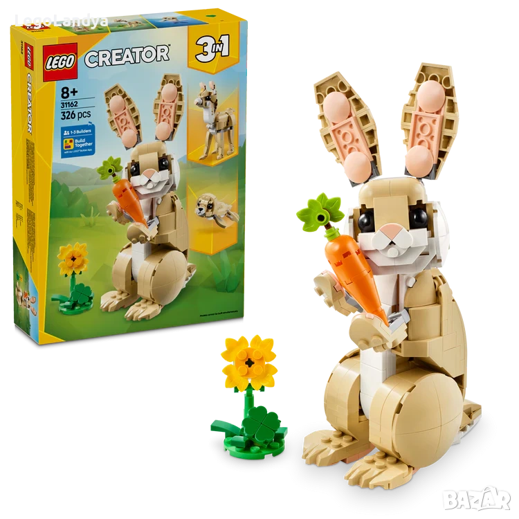 Изпратете момичета и момчета, обичащи животни, на забавни приключения с LEGO Creator Bunny (31162) от този 3-в-1 комплект за изграждане. Комплектът за игра с животни включва играчка зайче с подвижна глава, уши, предни лапи и задни крака.