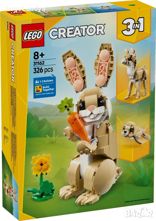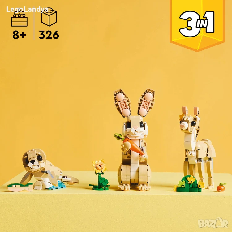 И трите сцени насърчават въображаемата игра. Моделите, идеални за игра и показване, са чудесен подарък. Комплектите LEGO Creator 3 в 1 предлагат три опции за сглобяване, разпалвайки въображението на децата, докато те ентусиазирано строят и престрояват моделите. Приложението LEGO Builder също така предоставя фантастично изживяване при сглобяване за всички. Важна забележка: Моделите не могат да се сглобяват едновременно. Сглобяемото зайче е високо 19 см. Съдържа 326 части.
