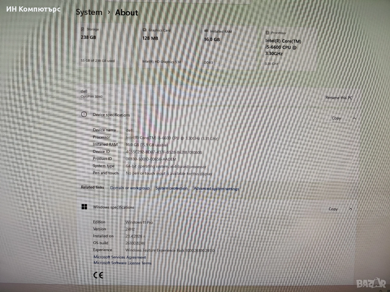Офис компютър в малка кутия SFF Dell Optiplex 5040. 16GB DDR3 рам памет на 1600MHz честота. SSD диск на SanDisk в перфектно здраве. Извършено е почистване от прах и е сменена термопроводящата паста. Инсталиран е с Уиндоус 11 ПРО за което има дигитален лиценз в БИОС и при всяка следваща инсталация си хваща ключа. Налична е и втора бройка при интерес пакетна цена за двете.