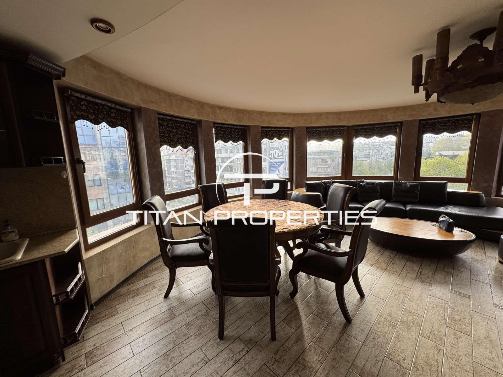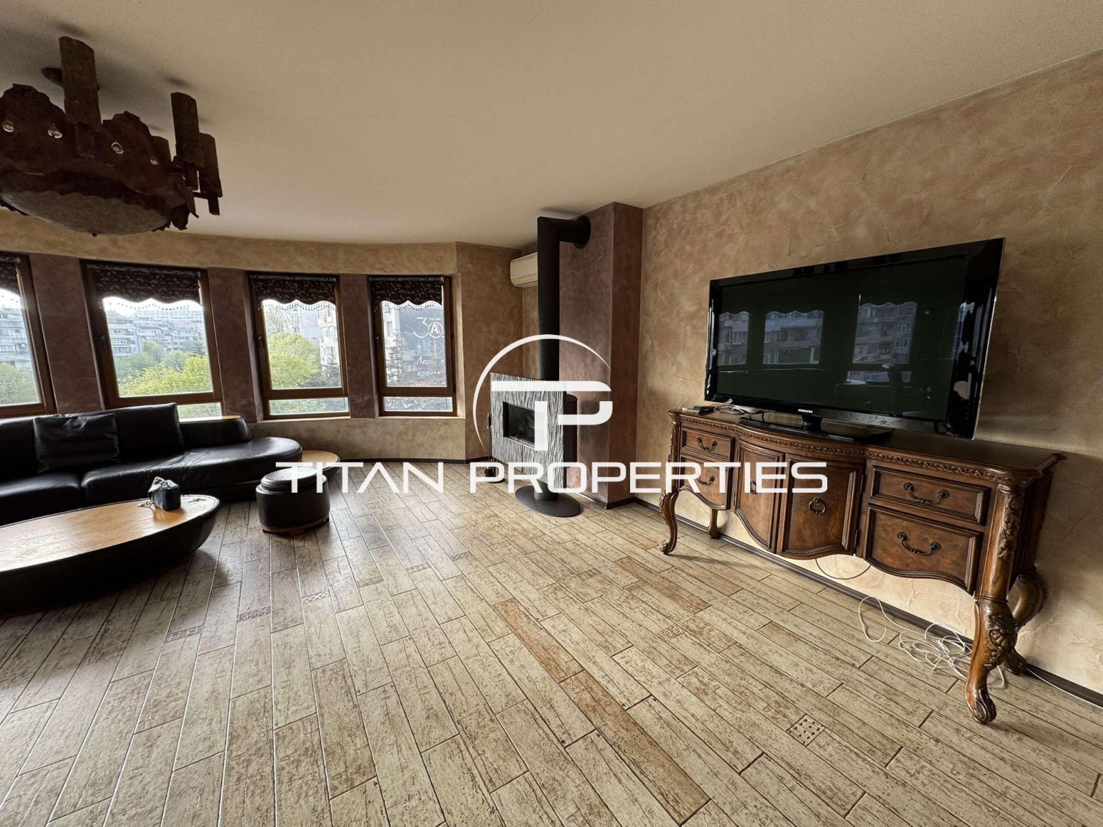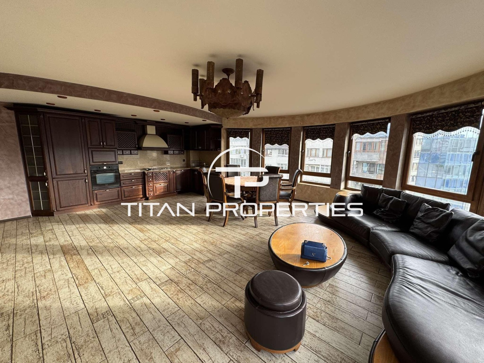 Имотът е ситуиран на 5-ти жилищен етаж, разполага с площ 120кв.м, разгънати в следното разпределение: коридор, просторна всекидневна с кухненски бокс и трапезария, две спални, баня с тоалетна, тераса