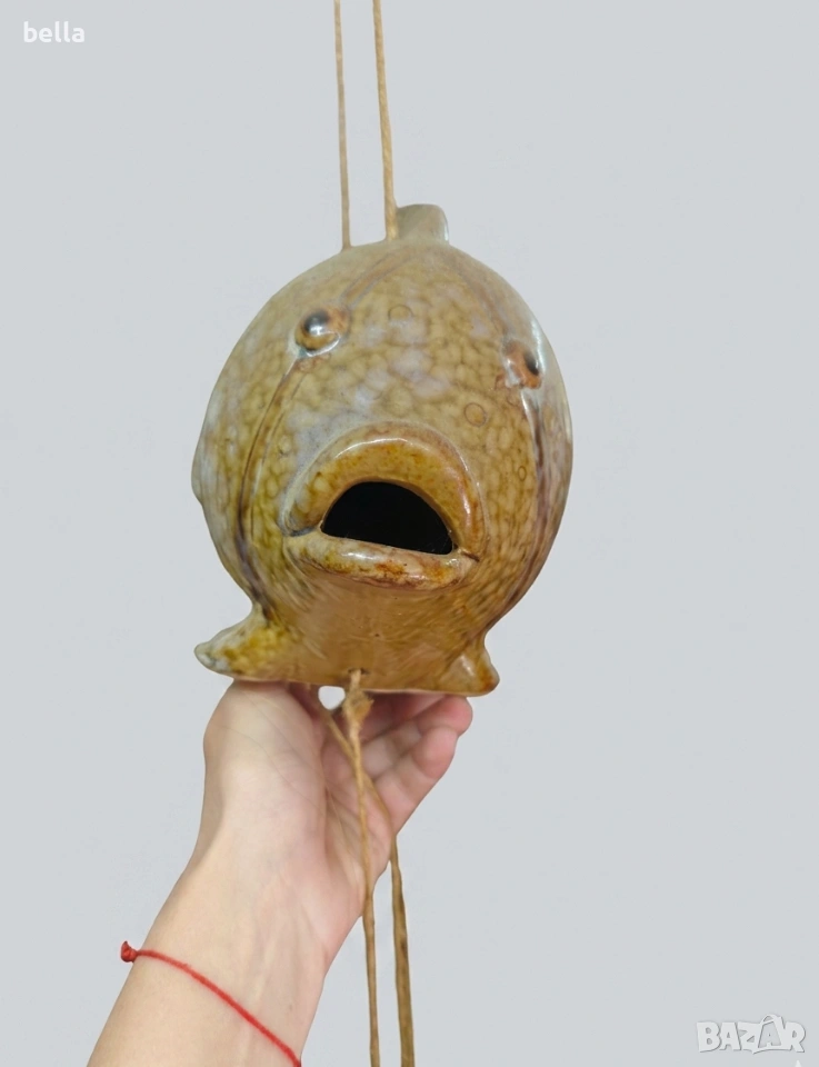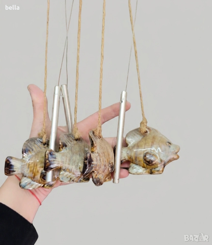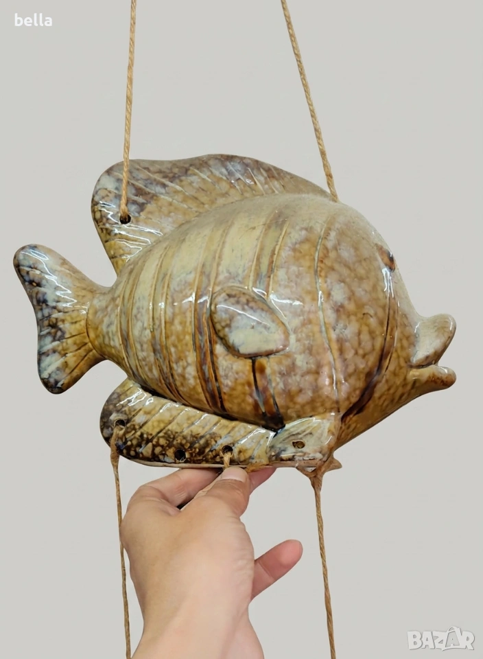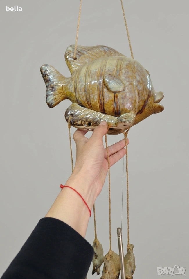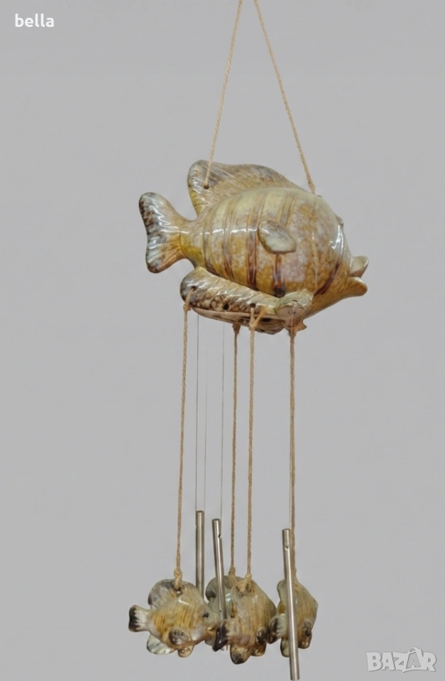 Керамичен масивен вятърен звънец -РИБИ. Уникална, ръчно изработена керамична декорация тип „музика на вятъра“ или вятърен звънец. Предметът е с изключително артистичен дизайн, изобразяващ голяма риба с висящи елементи (по-малки рибки и метални тръбички), които издават нежен звук при движение. Висококачествена глазирана керамика.Авторска ръчна изработка с преливащи кафяво-златисти нюанси. Специфичната патина и "пръски" по глазурата са нарочен арт ефект, който придава на рибата автентичен, античен вид. Здраво окачване на канап, готово за поставяне на тераса, в градина или в интериора.Дължина 80 см .Цена 75 евро
