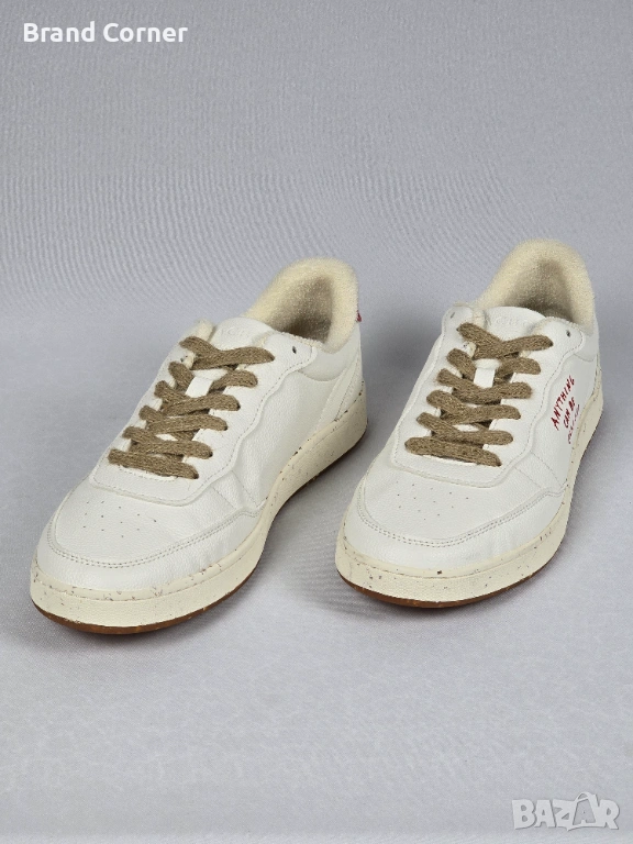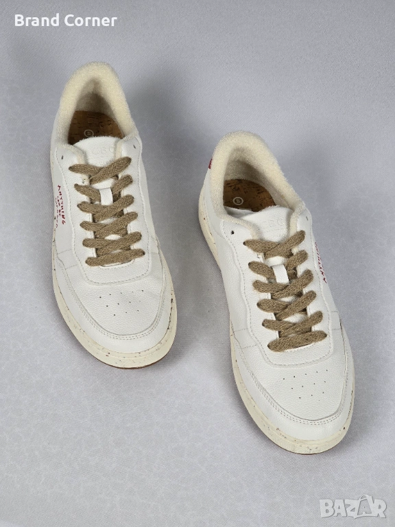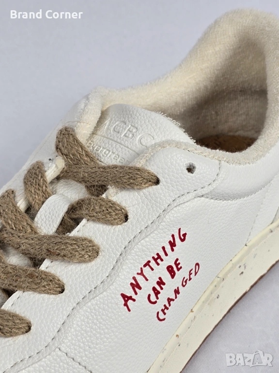 Нови ACBC кецове, размер 45, в цвят бяло с червен детайл на петата и характерния надпис “Anything Can Be Changed” отстрани. Моделът е нисък, удобен и подходящ за ежедневно носене, с изчистена визия, естествени кафяви връзки, мека текстилна подплата и коркова стелка. Подметката е кафява, с декоративен релеф и устойчиво усещане при ходене.