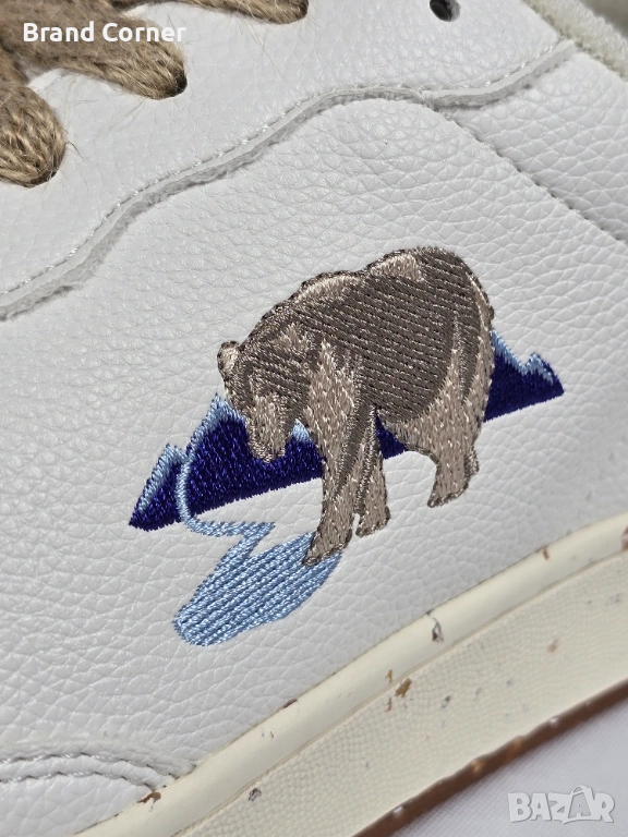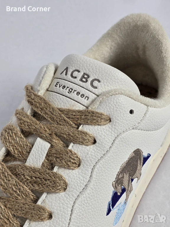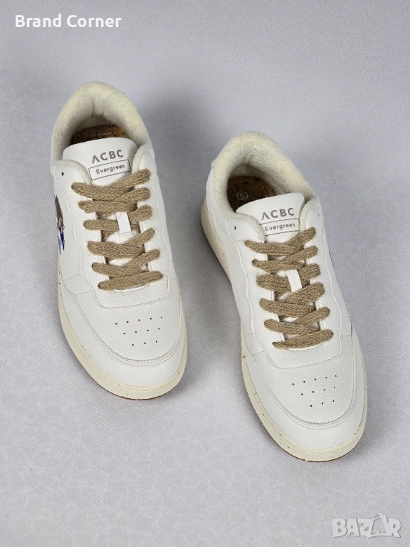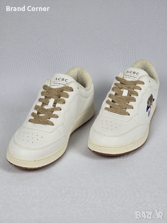 Нови ACBC Evergreen маратонки, размер 43. Моделът е в свежа бяла/кремава визия с натурални връзки тип коноп/юта, мека текстилна подплата и коркова стелка с надпис “Anything can be changed”. Отстрани имат много красивa бродерия с мечка и планински мотив в синьо, което ги прави по-интересни и различни от стандартните бели сникърси.