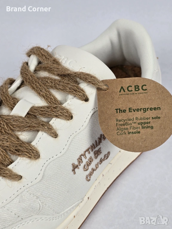 Нови ACBC The Evergreen кецове в бял/кремав цвят с естествено изглеждащи джутени връзки и коркова стелка. Моделът е стилен, изчистен и много удобен за ежедневна визия – подходящ както за casual, така и за спортно-елегантно облекло.
