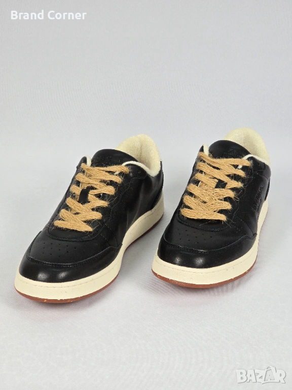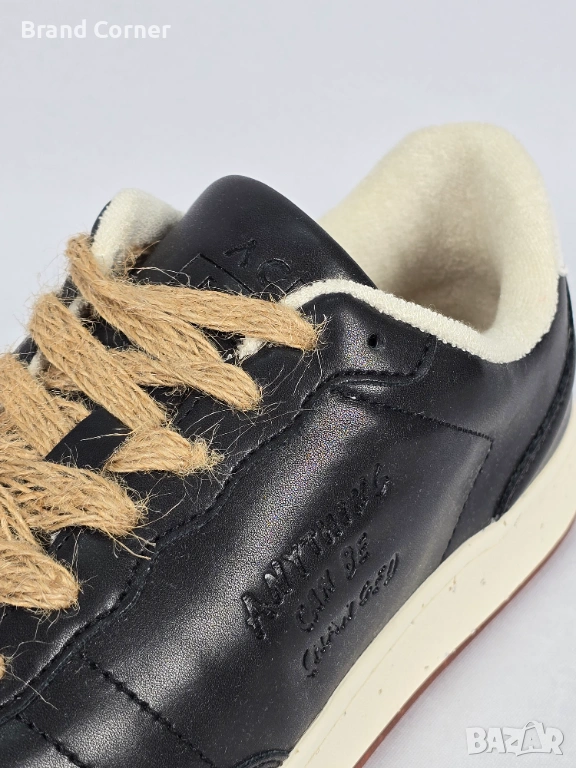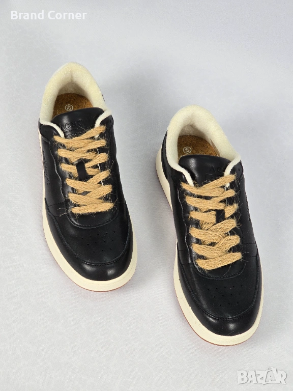 Обувките са с черна горна част, бяла задна пета с логото ACBC, светла междинна подметка и кафява външна подметка с красив релефен флорален мотив. Връзките са от естествена ютена материя, а вътрешната стелка е с корково покритие – удобна и дишаща. Вътрешната част е мека и комфортна, в светъл цвят.