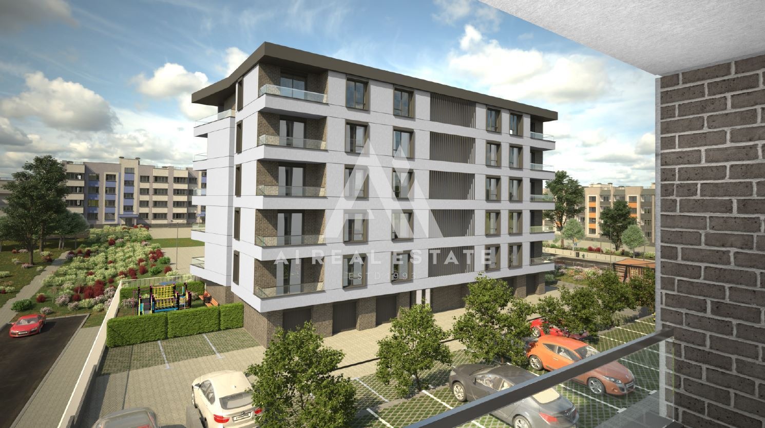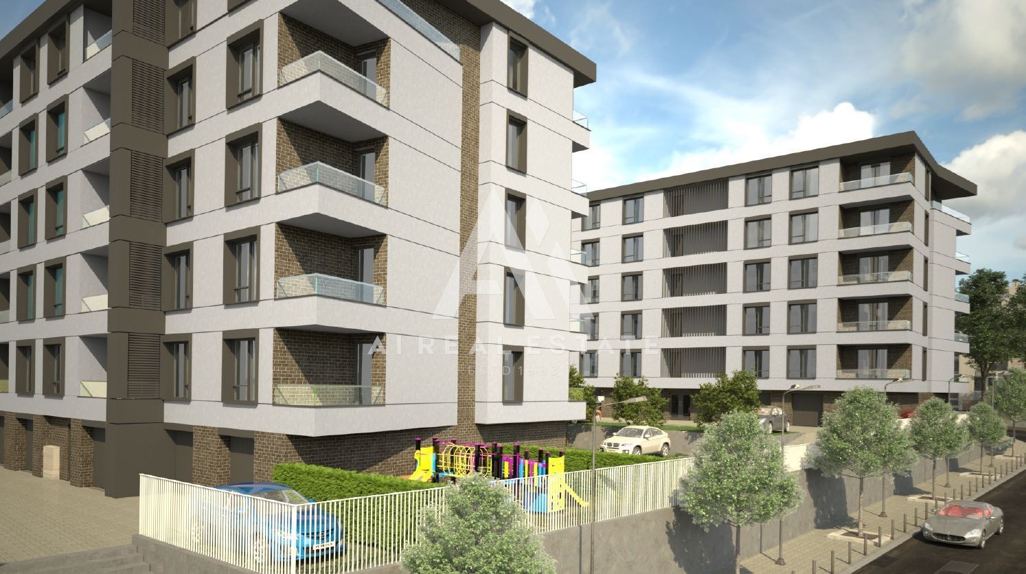 Средата около сградата също е решена с внимание към детайла озеленяване, алеи, детска площадка, LED осветление, вертикална планировка и дренажни решения. Това придава завършен и модерен характер на целия проект.