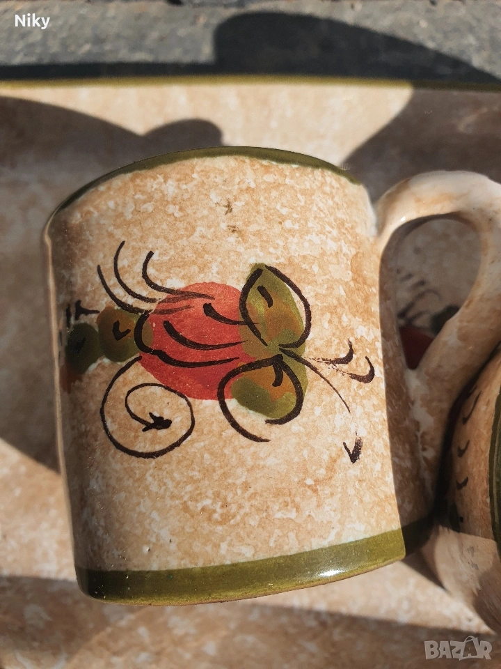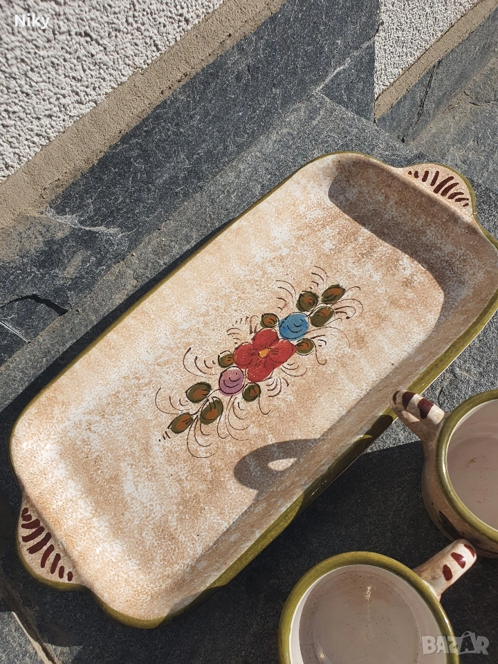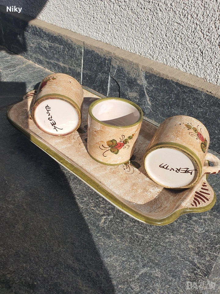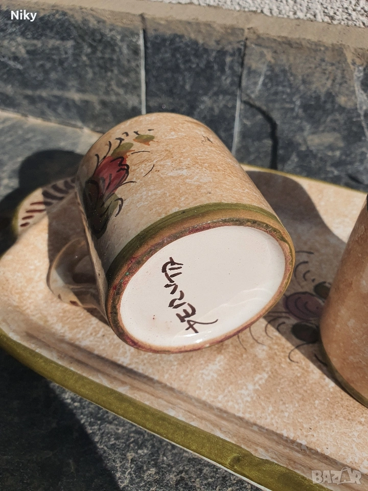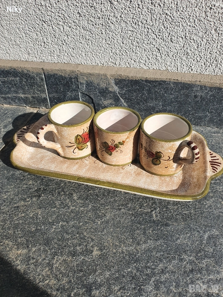Ръчно изработени керамични чаши върху поднос, често използвани за сервиране на кафе или като декоративен елемент. Материал: Керамика или глина. Дизайн: Ръчно рисувани флорални мотиви в рустикален стил. Употреба: Подходящ за сервиране на кафе или като част от интериора. Особеност: Уникат, тъй като е ръчно изработен.