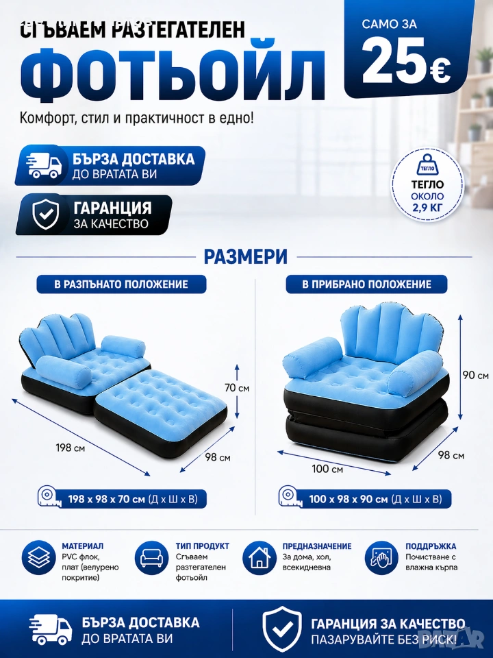 Търсиш удобно и практично решение за дома? Този модерен сгъваем фотьойл се превръща в легло само за секунди! 🛋️➡️🛏️