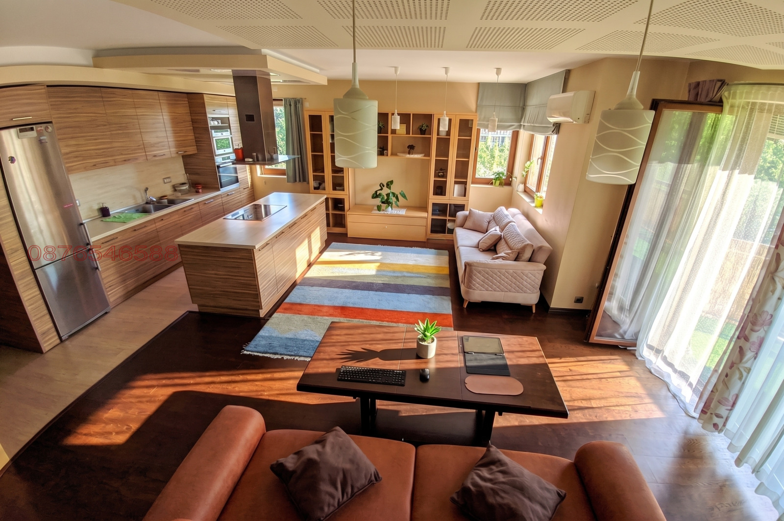 Кухня: Отворен план с голям барплот и кухненски остров, оборудван с индукционен плот и дизайнерски аспиратор тип камбана. Висок клас електроуреди (съдомиялна, хладилник, фризер, печка, микровълнова).