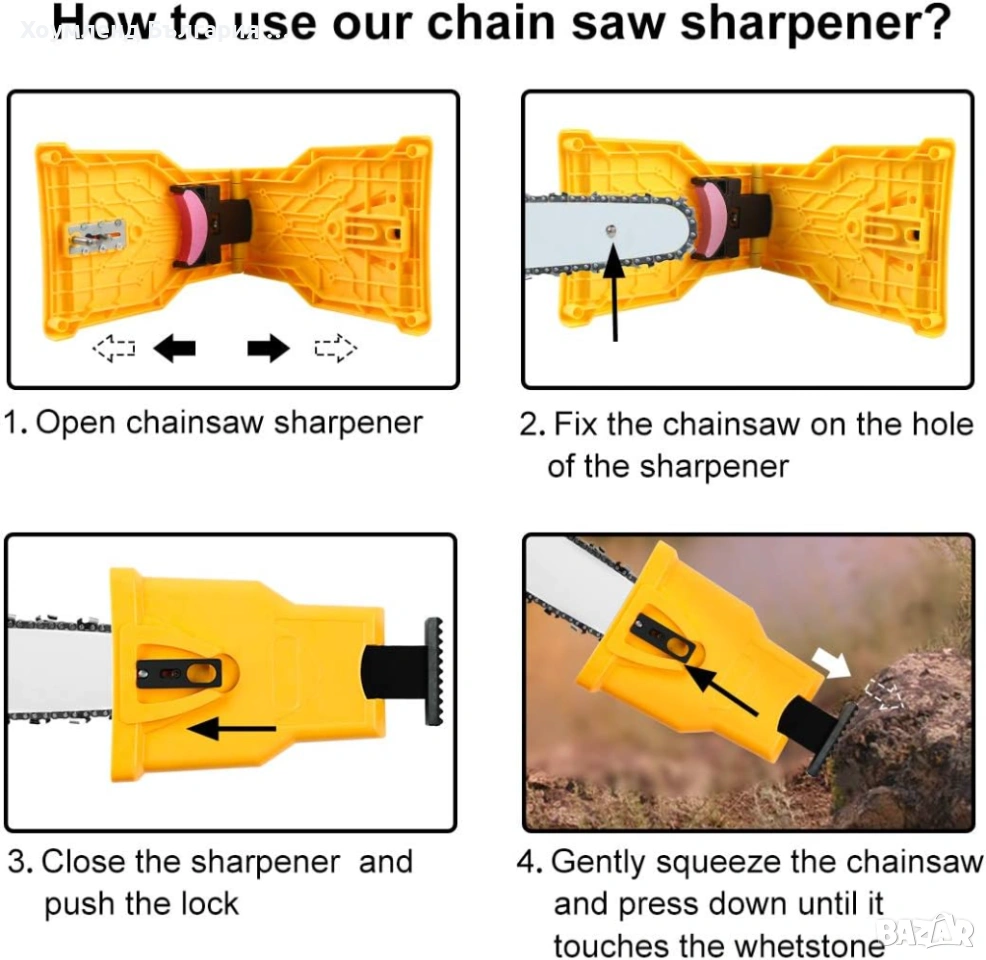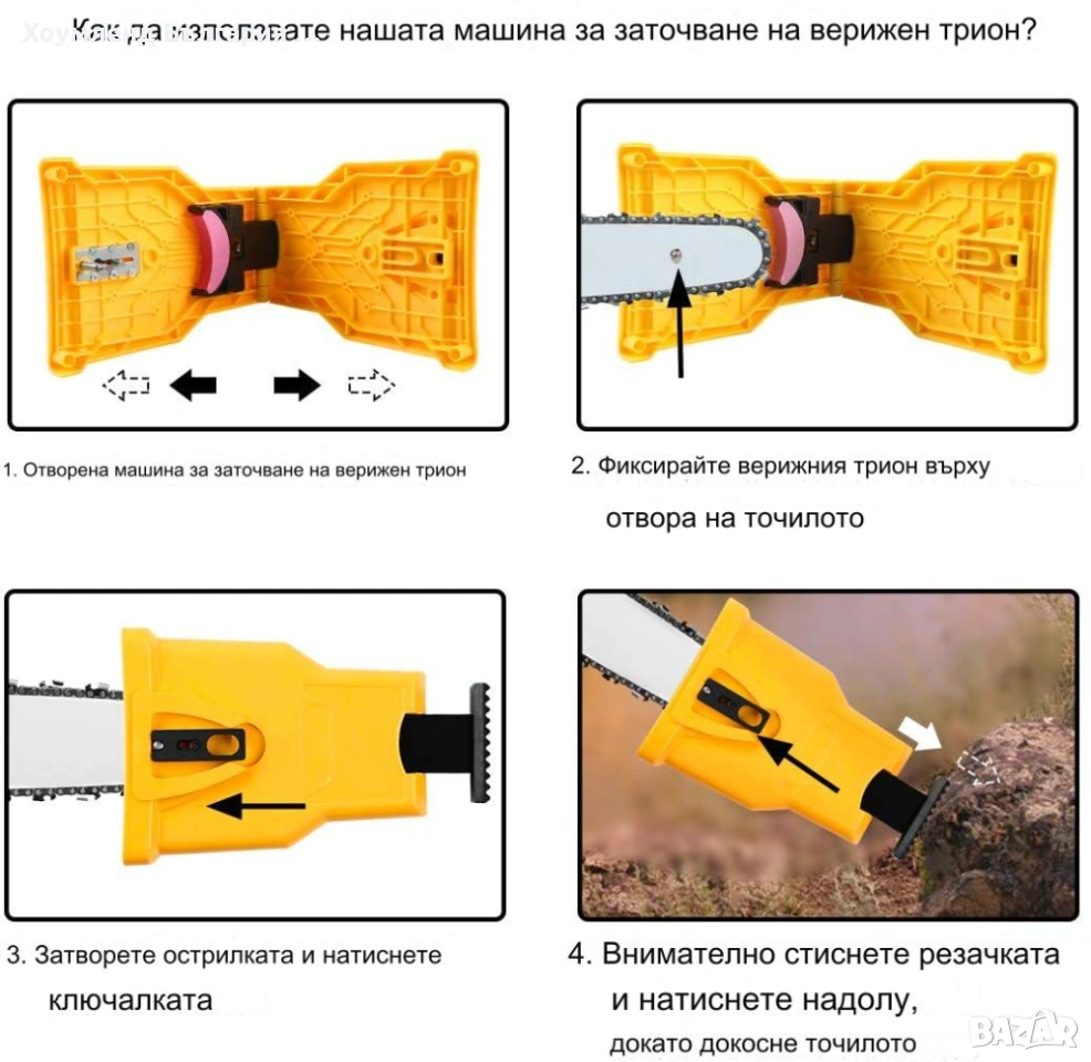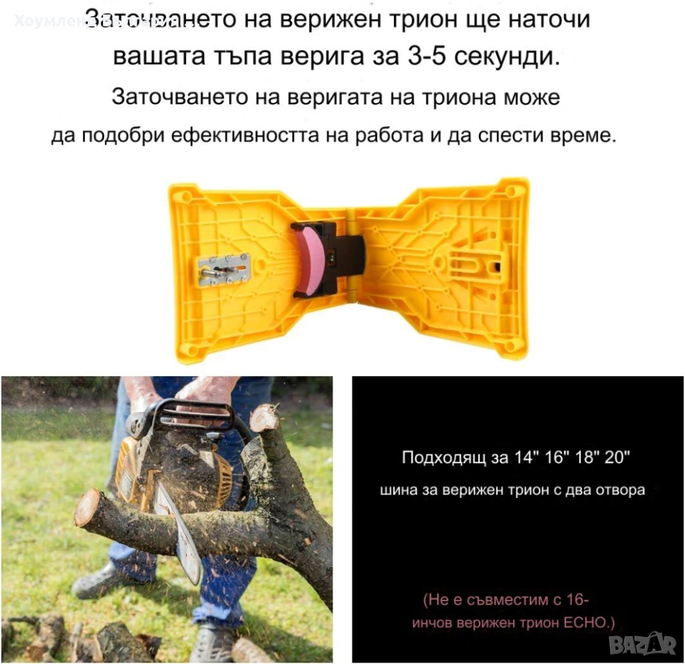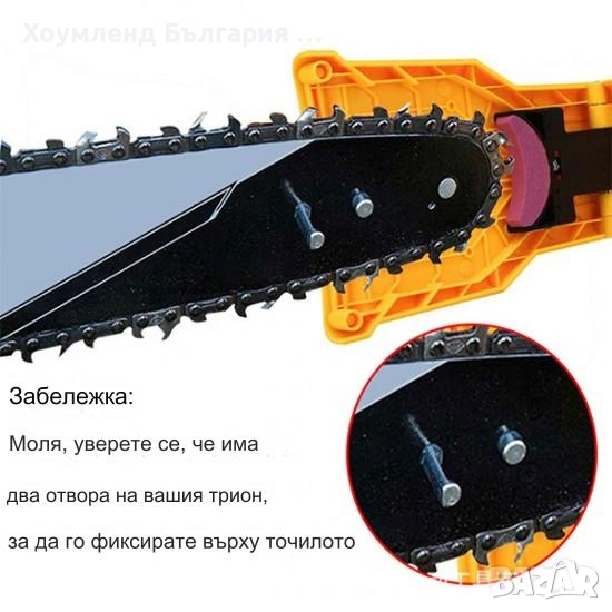 Точилото е съвместимо с повечето верижни триони с двоен отвор (т.е. 14 "/ 16" / 18 "/ 20").