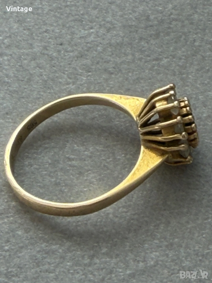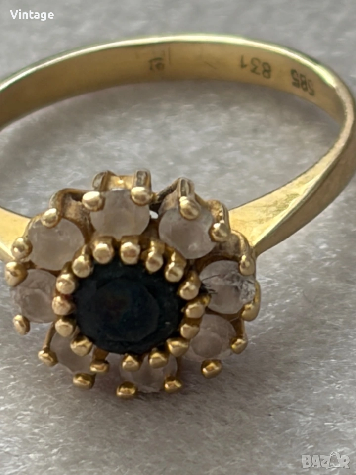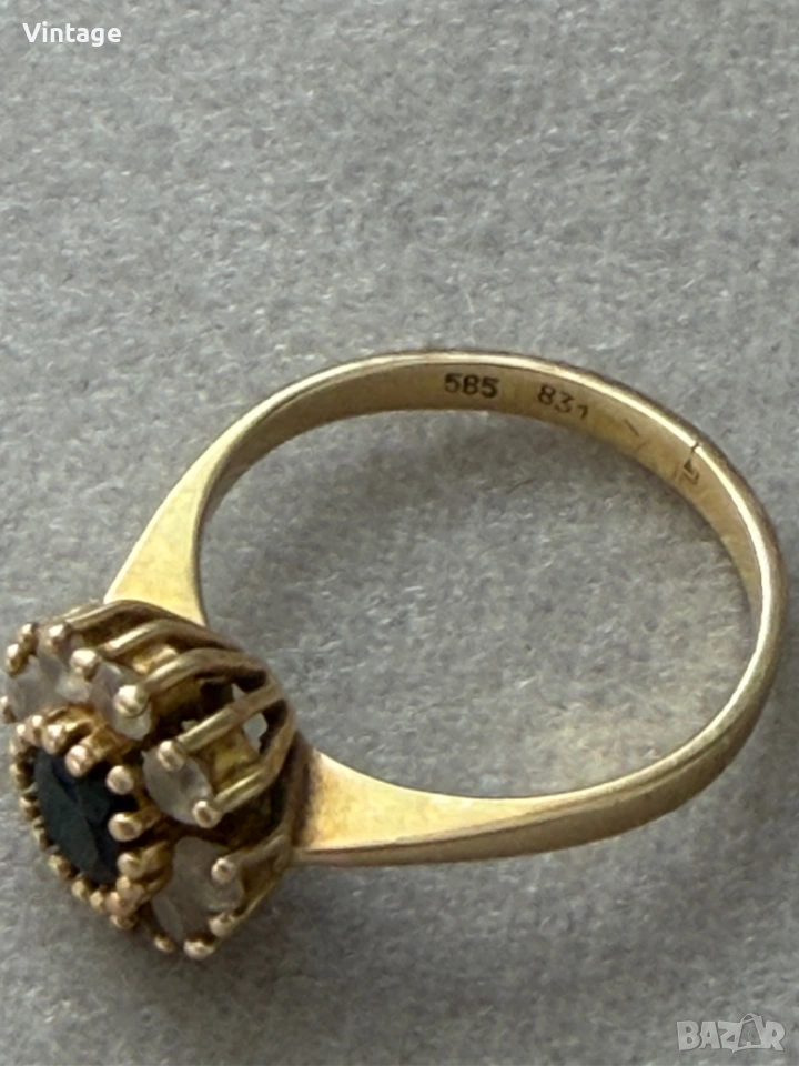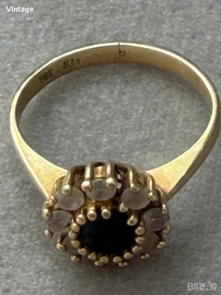 Старинен златен пръстен 14к. проба 585 с естествени камъни с маркировки . Размер 17мм. тегло 3,20гр. Много красив, старинна изработка, в отлично състояние.