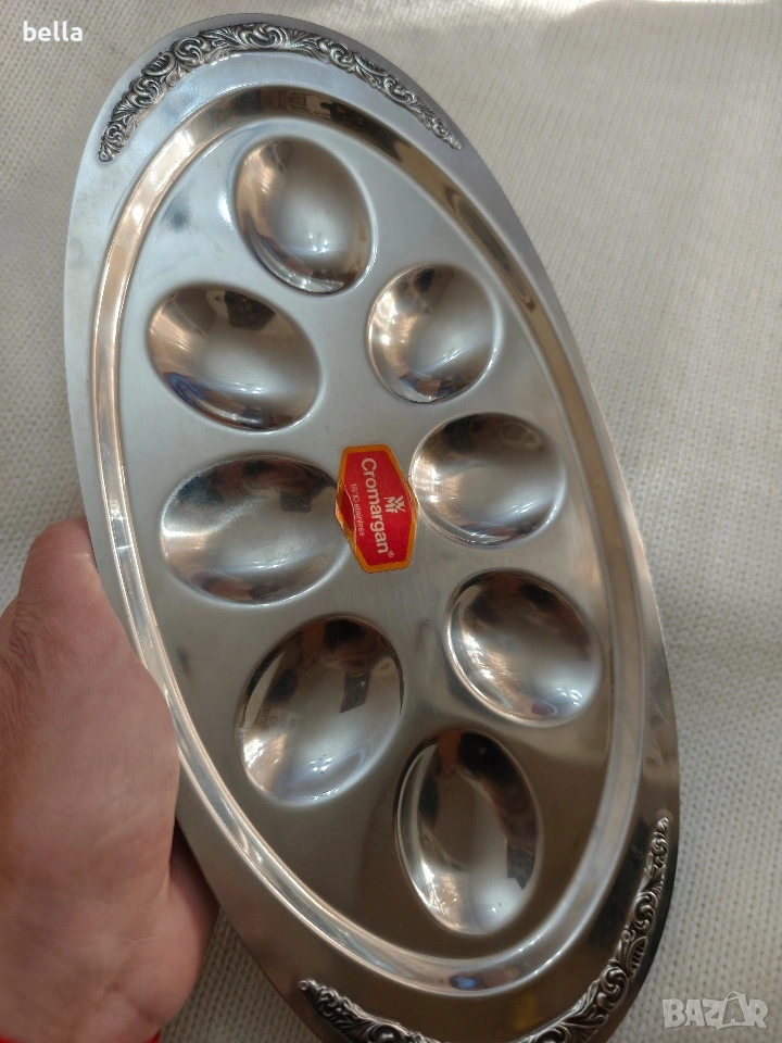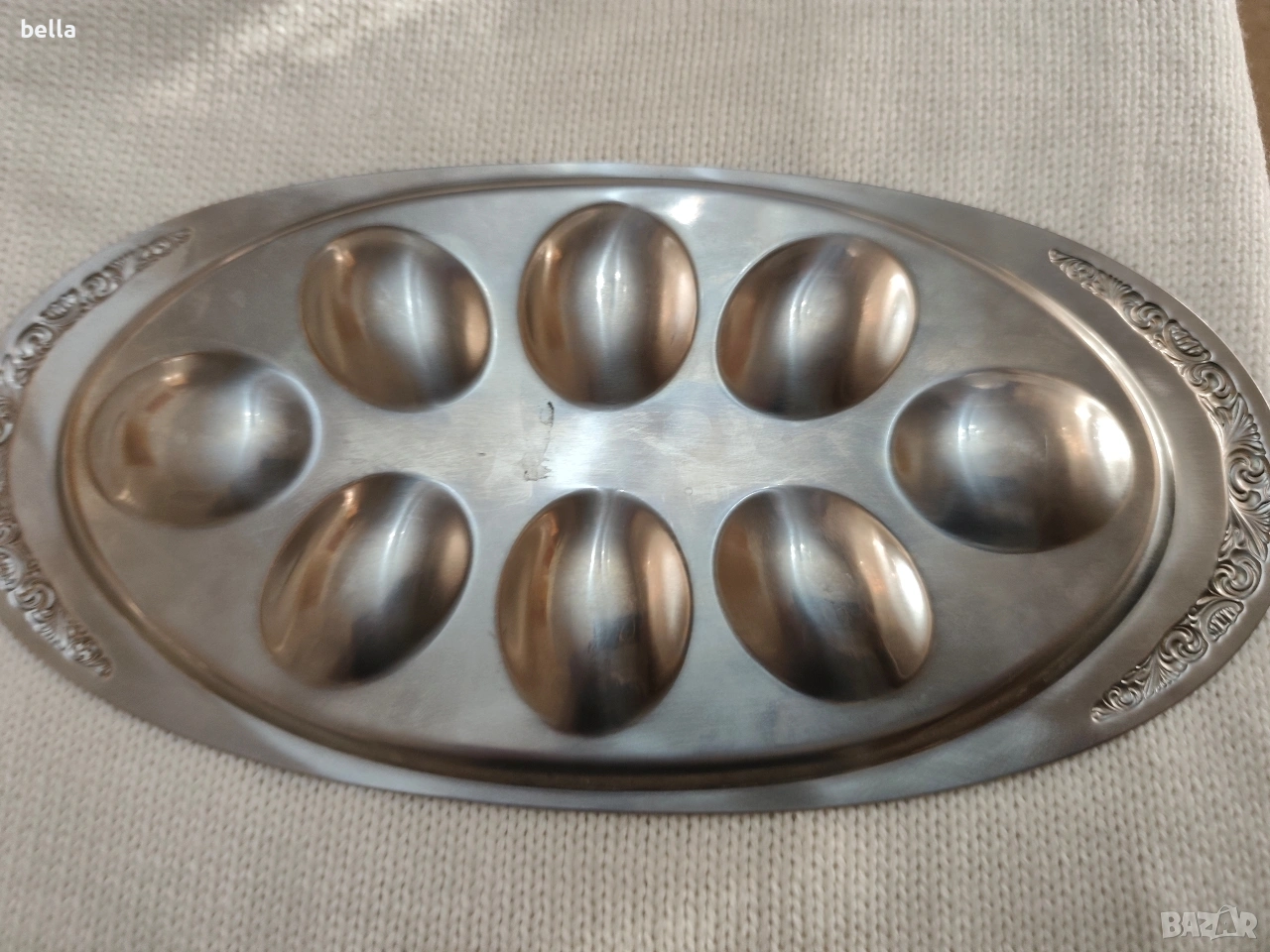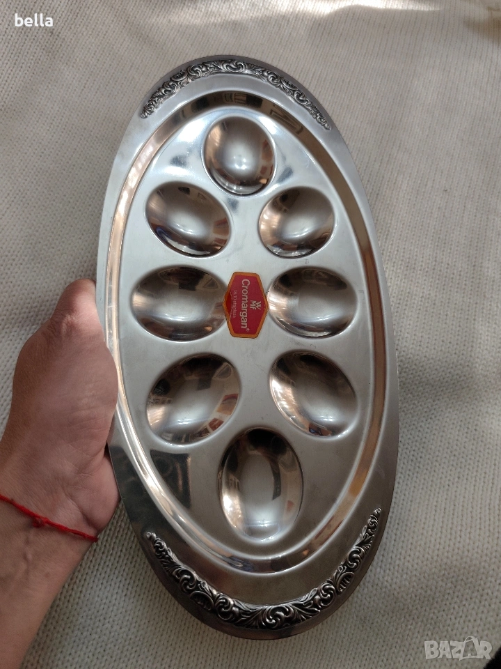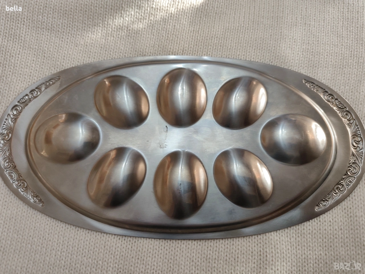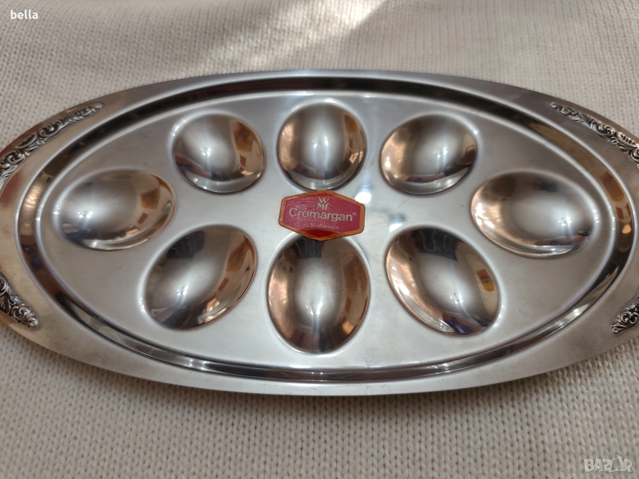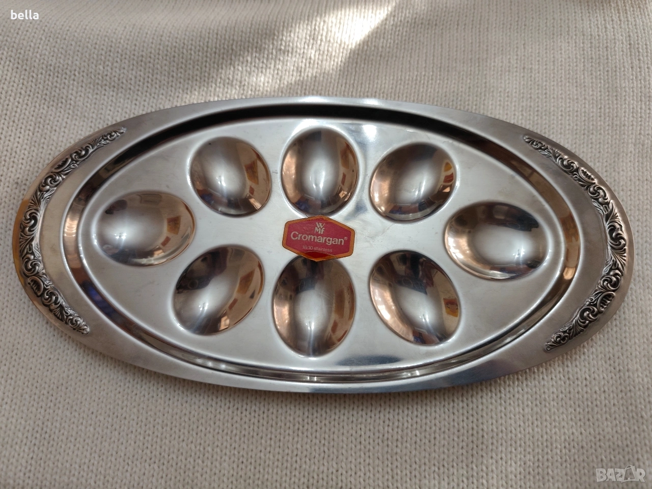 Винтидж плато за яйца WMF Cromargan – Неръждаема стомана Стилно винтидж плато за сервиране на яйца от световноизвестната немска марка WMF.Висококачествена неръждаема стомана Cromargan 18/10 (устойчива на надраскване и лесна за почистване). Овална форма с декоративен борд (бароков мотив) и 8 гнезда за яйца.Отлично запазено, с оригинален стикер (видно от снимките),ново не е ползвано. Идеално за празнична трапеза, Великден или като колекционерски предмет. Класически немски дизайн, който добавя елегантност към всяко сервиране.Цена 60 евро