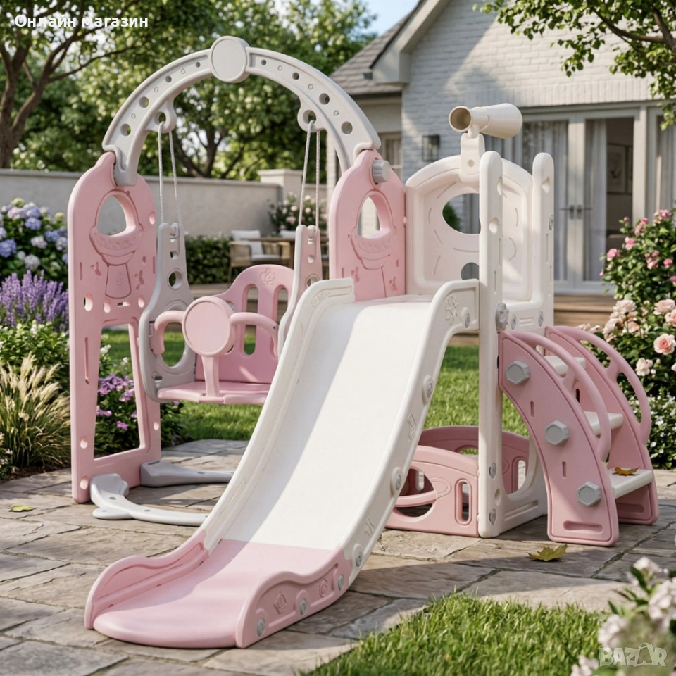 1. Детска пързалка с люлка 4в1, подходяща за деца до 12 г. С включени аксесоари баскетболен кош и телескоп. Цена 110€