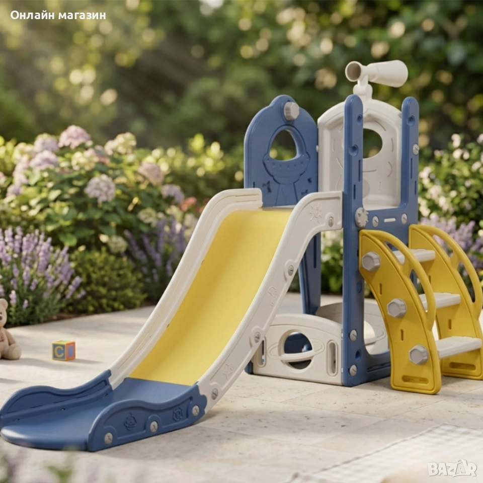 2. Детска пързалка със здрава конструкция и UV защита. Подходяща за деца до 12 г. С включени аксесоари баскетболен кош и телескоп. Цена 80€.