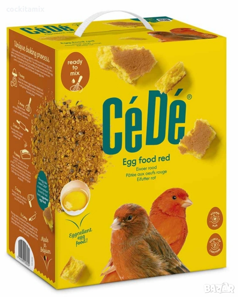 Допълваща храна за цветни канарчета и европейски чинки с червен фактор. Наличието на ß-каротин в яйчната храна поддържа червения цвят на оперението. Яйчната храна CéDé, базирана на уникалната яйчена тортила CéDé, съдържа всичко, от което вашите птици се нуждаят за успешно размножаване. Давайте на вашите птици червена яйчена храна CéDé заедно с основната им храна, за да допълните диетата им. За да постигнете интензивен червен цвят, добавете CéDé Carored червен фактор към яйчената храна или водата за пиене по време на размножаване и линеене. NB: самата яйчена храна не е червена на цвят!