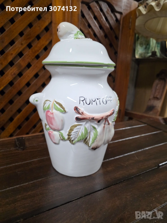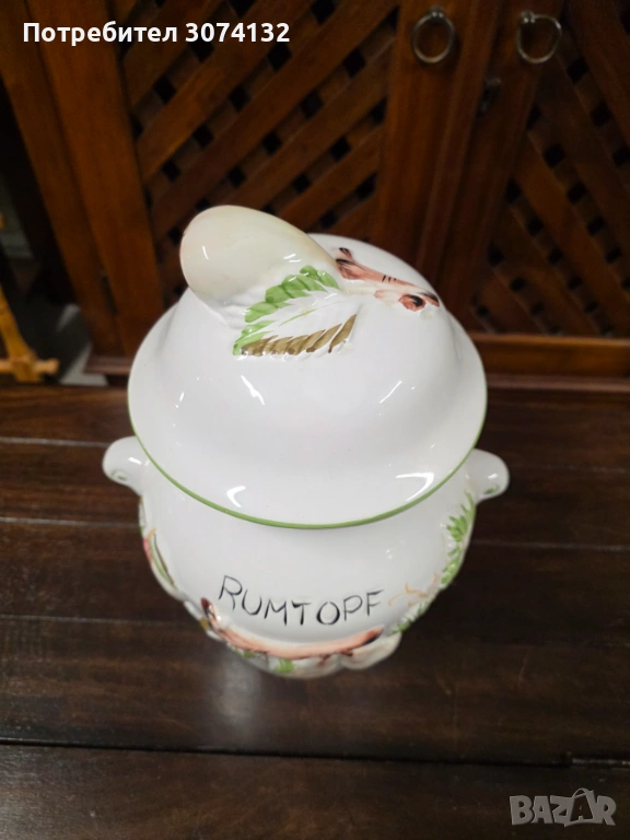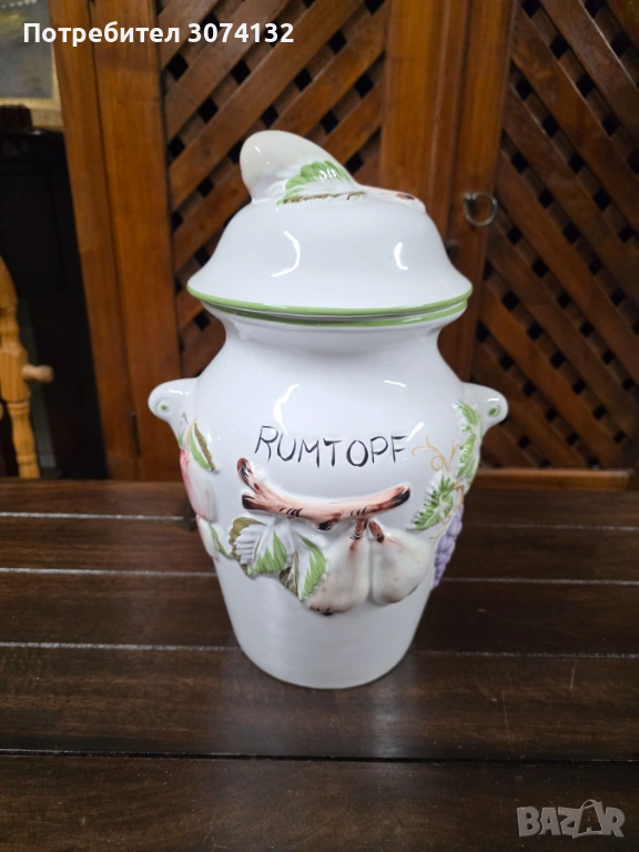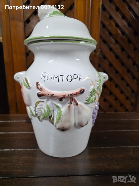 Декоративна керамична буркан с надпис 'Rumtopf' и релефни цветни мотиви. Подходящ за съхранение на плодове, различни продукти или за украса на кухнята 36 см.
