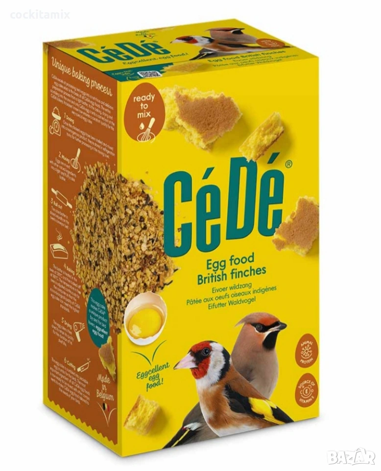 Суха храна за яйца Eggcellent за британски чинки. Допълваща храна за британски или европейски чинки. Тази храна за яйца е с по-високо съдържание на протеини, необходимо по време на отглеждането на малките птици. Храната за яйца CéDé, базирана на уникалната яйчена тортила CéDé, съдържа всичко, от което вашите птици се нуждаят за успешно размножаване. Давайте на вашите птици храна за яйца CéDé за британски или европейски птици, заедно с основната им храна, за да допълните диетата им.