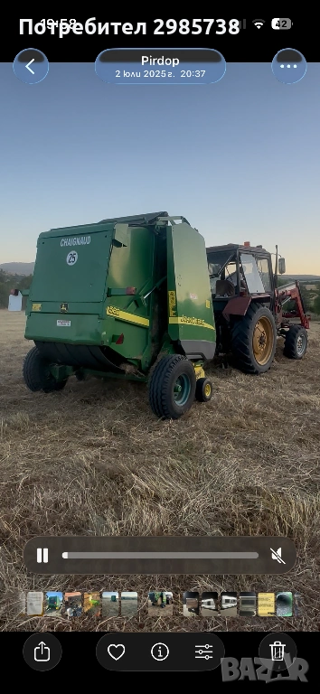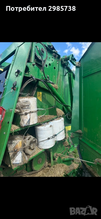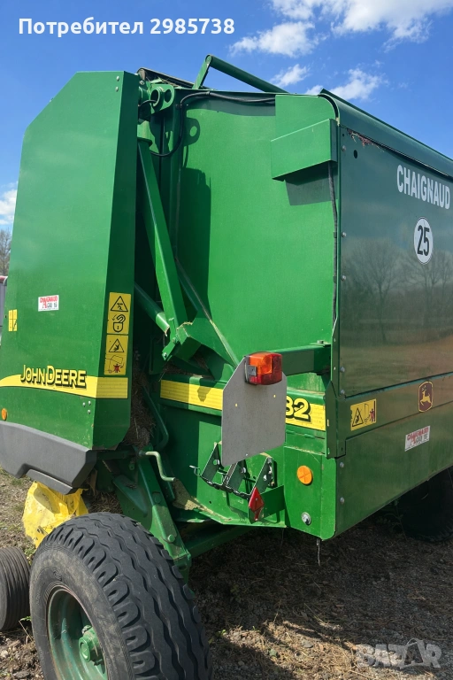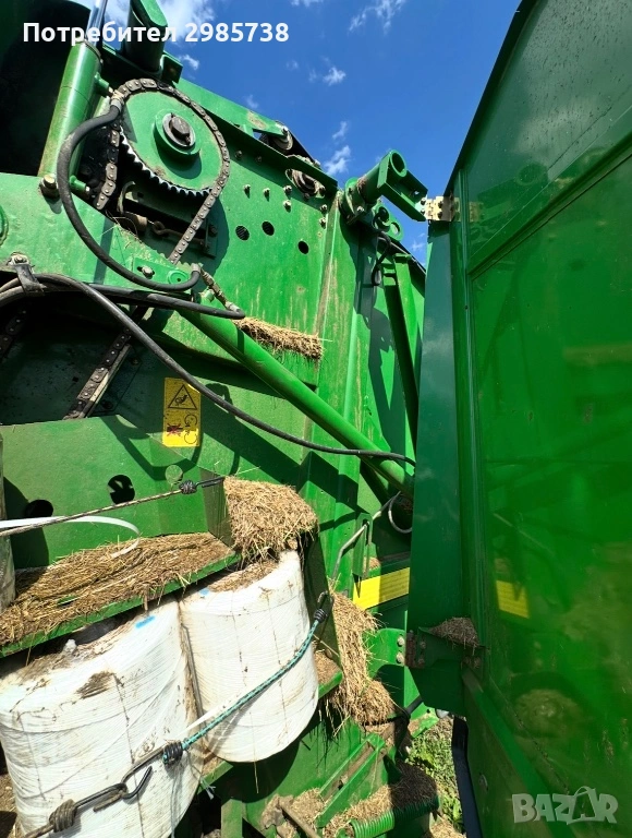 John Deere 582 в безупречно състояние. Перфектни ремъци, проверени лагери и изряден подбирач. Без заварки в оригинален не пребоядисван вид. Безупречна работа. Безупречна в механично, хидравлично и електрическо отношение. Проба на място свързване на цялата машина към трактор с кардан, хидравлика и управление от кабината. Пълен тест без компромис. В комплект с кардан!