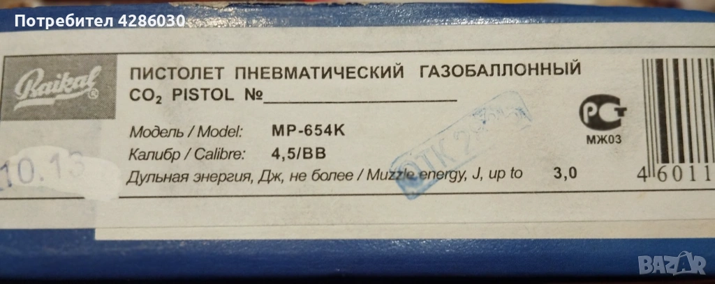 Въздушен пистолет Baikal 654 K 4.4 mm → Обява 54306685