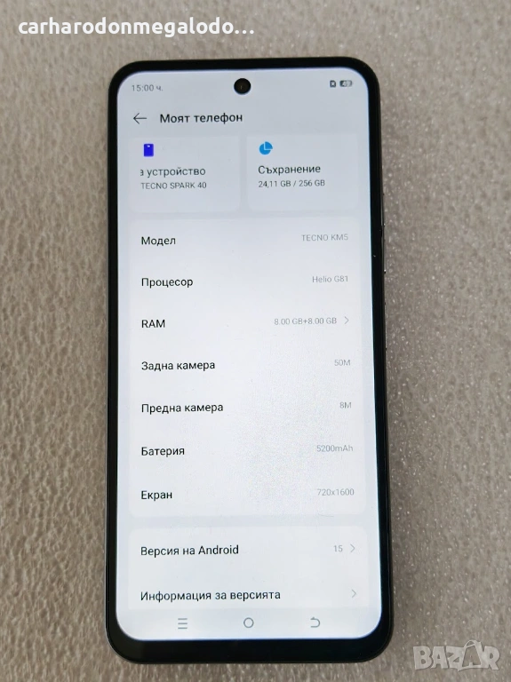 Tecno Spark 40 256GB 8GB RAM Перфектен Като Нов.Телефона е купуван нов от Германия преди 4 месеца на цена от 277 Евро .ВСИЧКО РАБОТИ ПЕРФЕКТНО РАБОТИ С ВСИЧКИ ОПЕРАТОРИ БАТЕРИЯТА ДЪРЖИ 3 ДНИ . Продава се само телефона Всичко друго остана в Германия.Дисплей