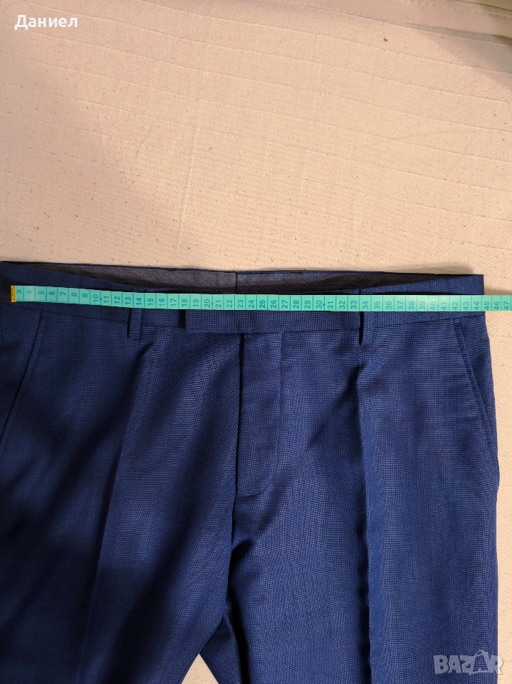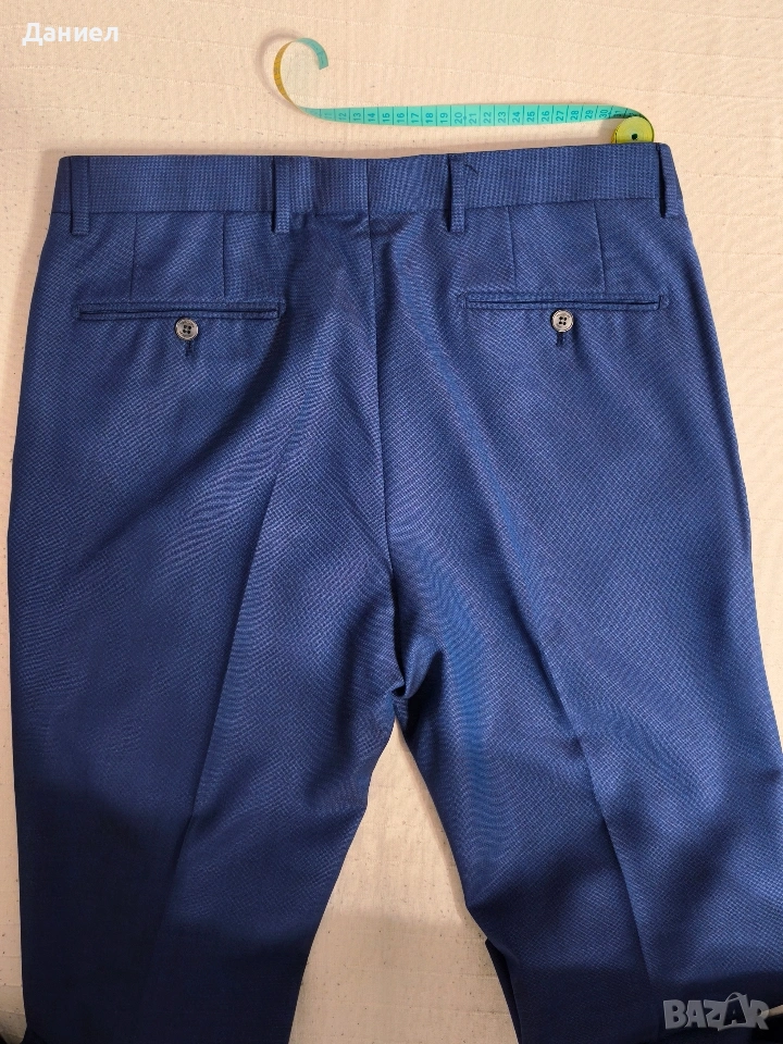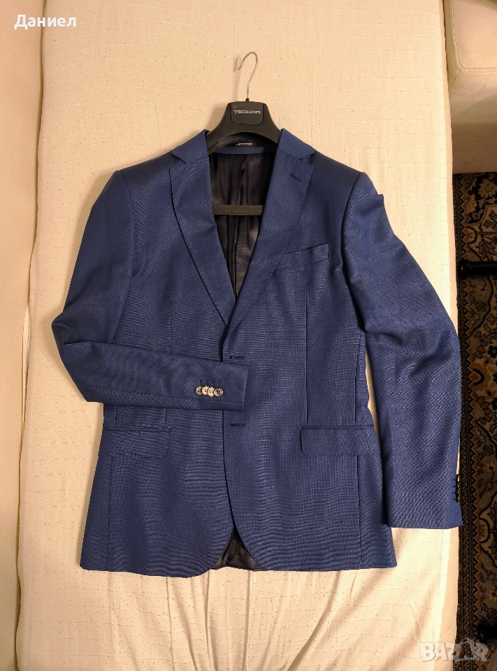 Продавам тъмносин костюм Teodor (Super 120’s – 88% вълна, 8% полиамид, 4% еластан), носен само веднъж за бал. В перфектно състояние.