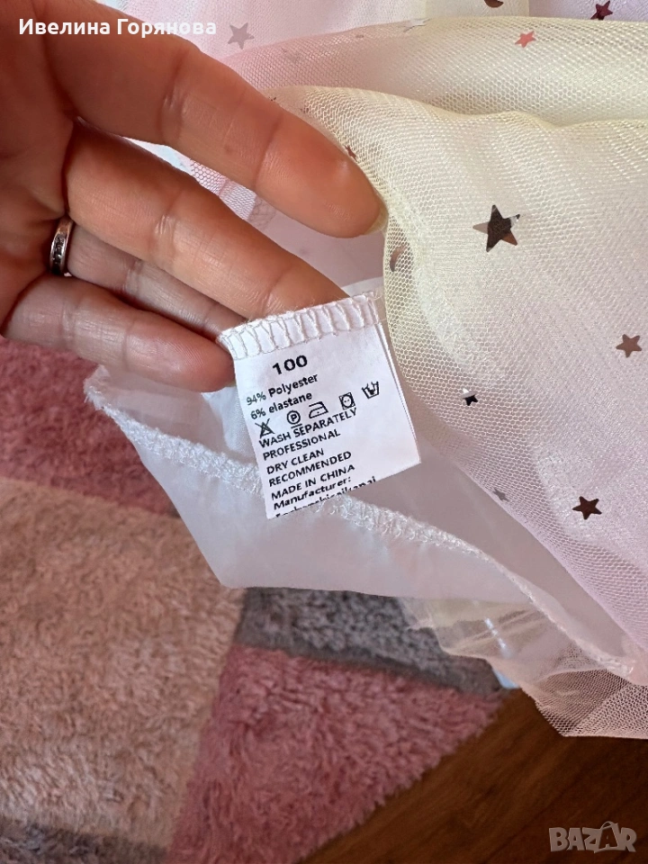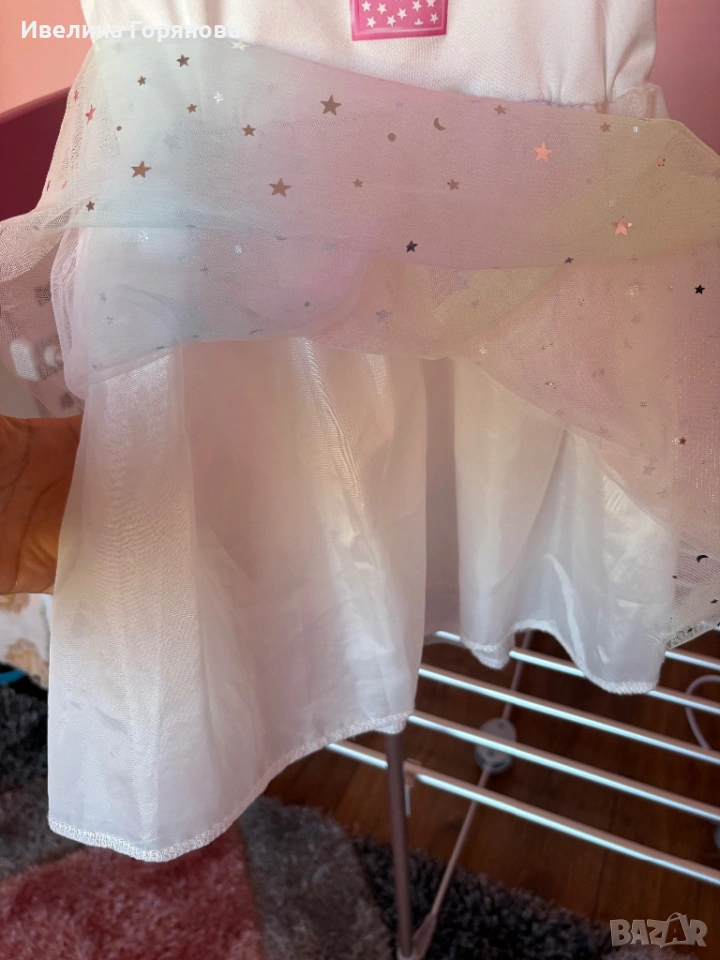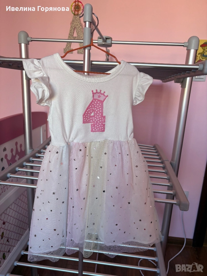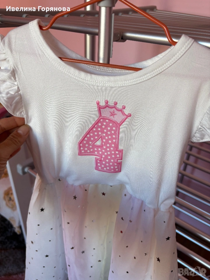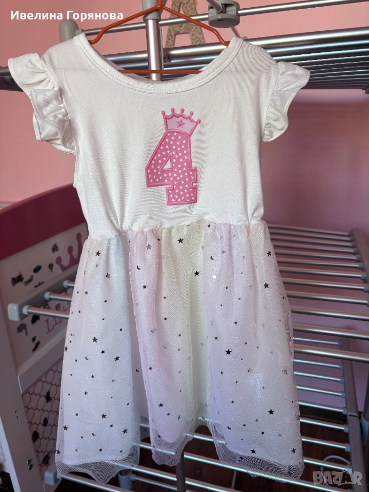 С ефектен дизайн с цифра „4“ и коронка отпред – перфектна за малка принцеса в нейния специален ден. Долната част е от фин тюл със звездички, което придава още по-приказен вид ✨