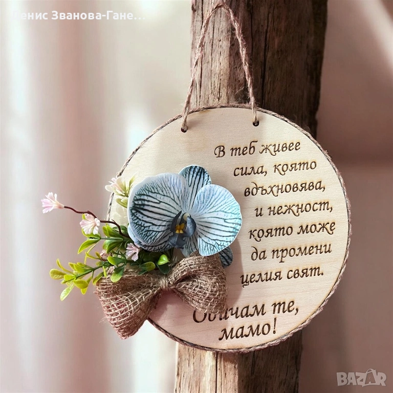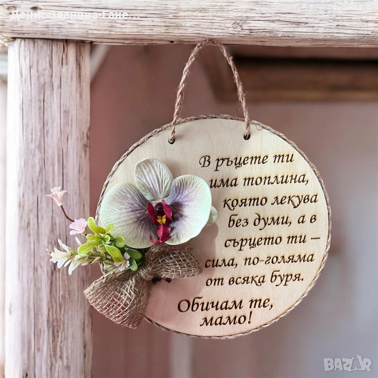 Предлагаме красив дървен плакет във формата на кръг, изработен с внимание към всеки детайл. Декориран с естествено конопено въже и нежни цветя, той съчетава рустик чар и елегантност.