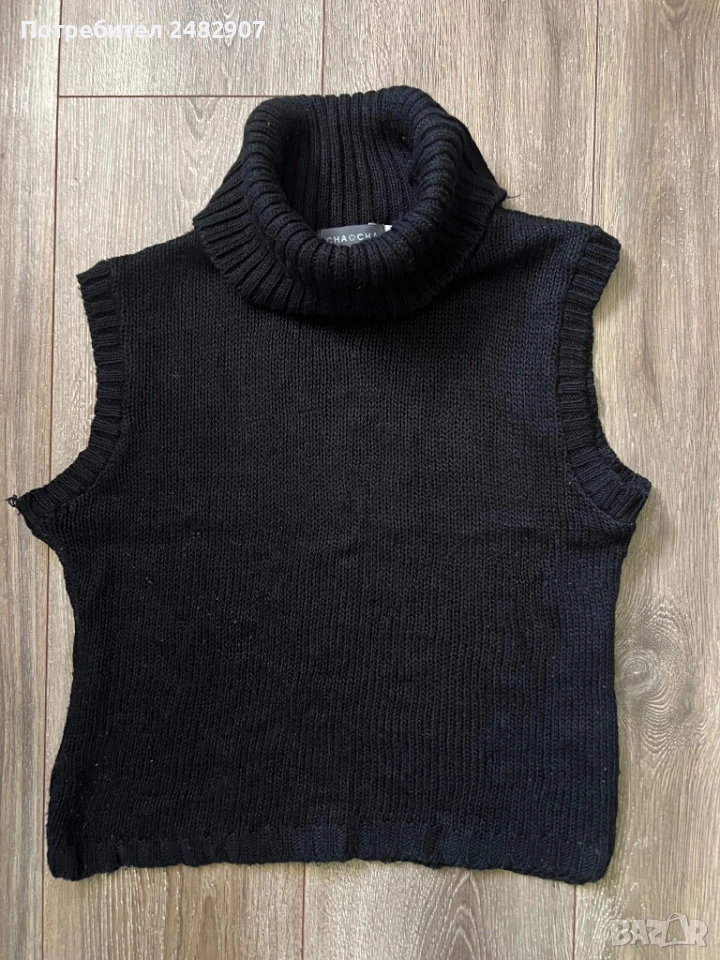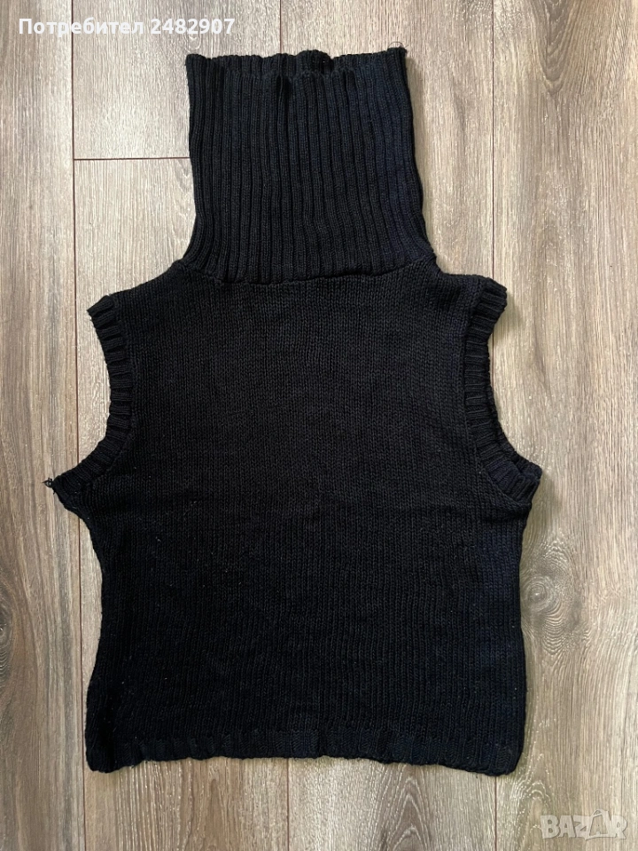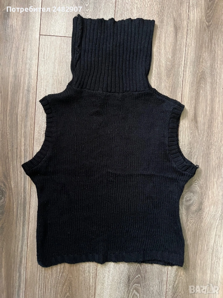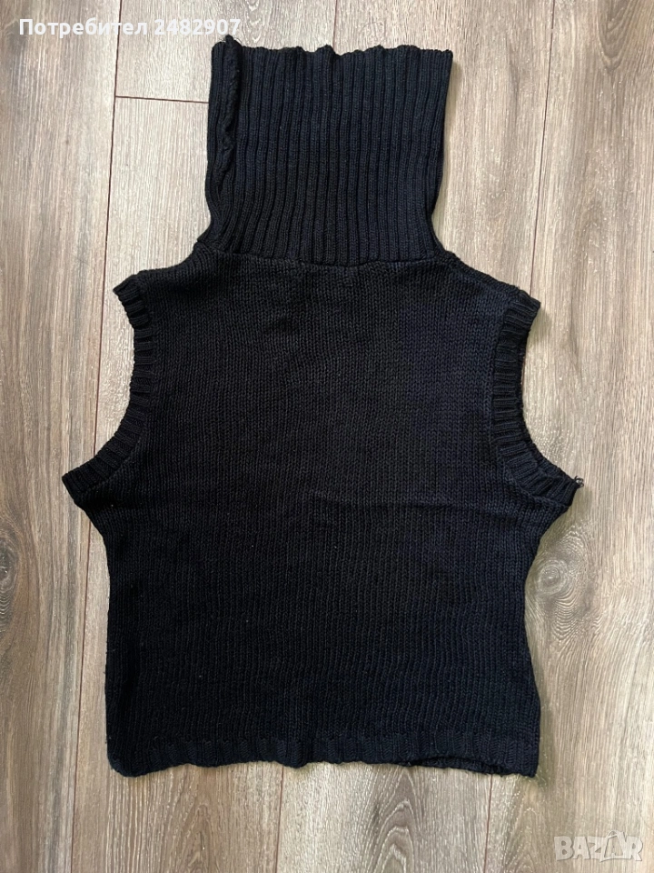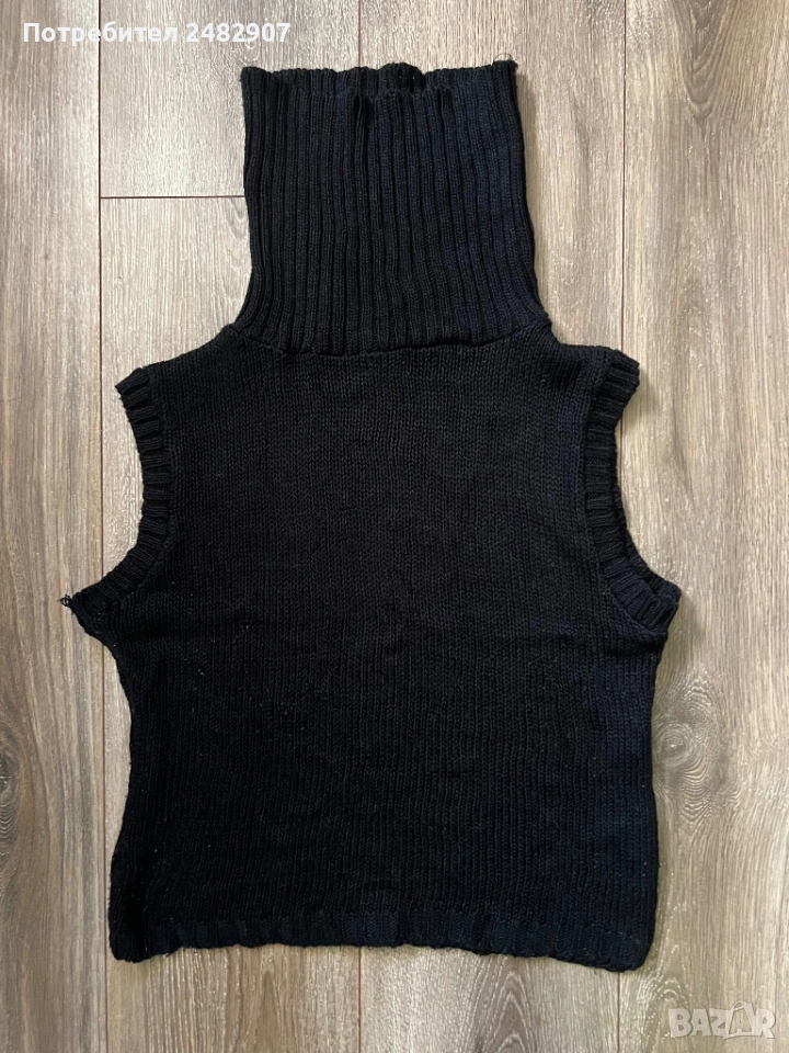 Машинно плетено черно дамско поло без ръкави, размер S. Съдържа 100 % акрил. Ширина в раменете - 40 см, ширина под мишниците - 47 см, ширина в долната част - 42 см, дължина от рамото до долу - 48 см, височина на полото - 20 см. Много запазено, почти не е използвано, разтегливо.