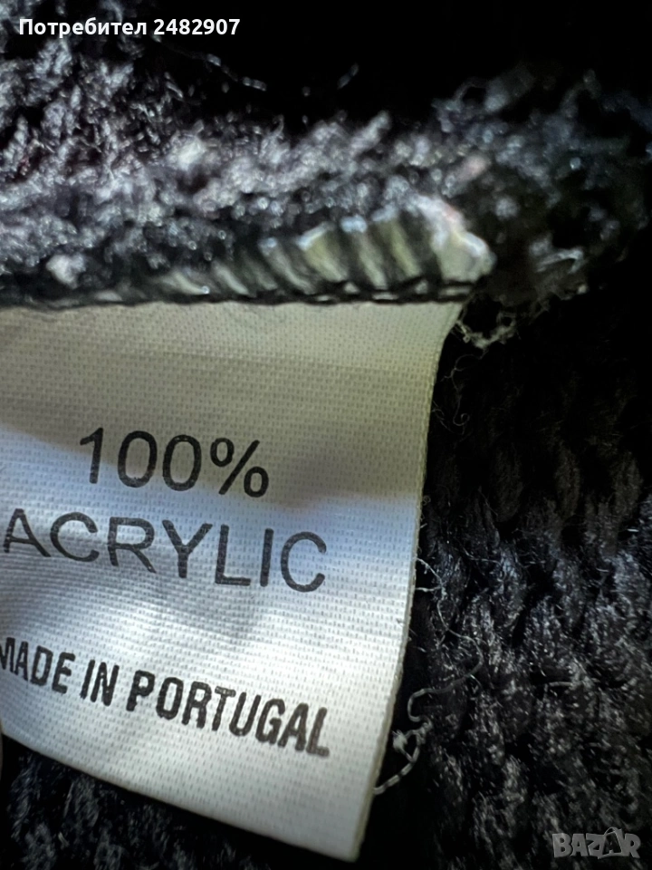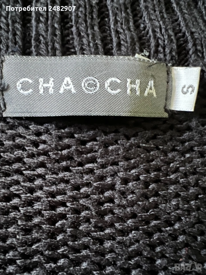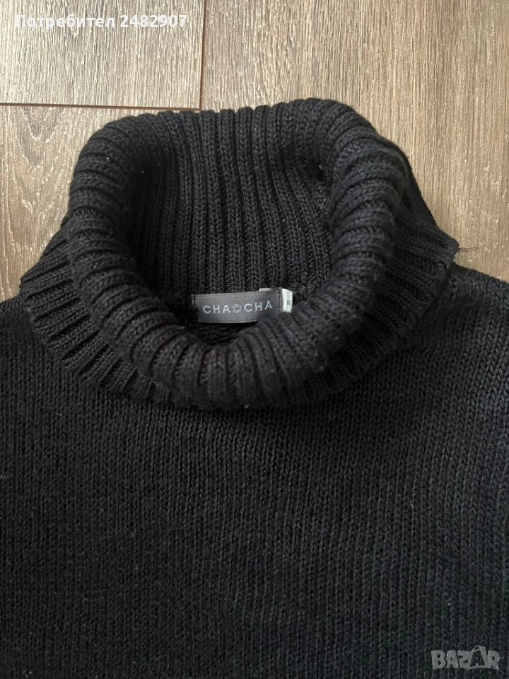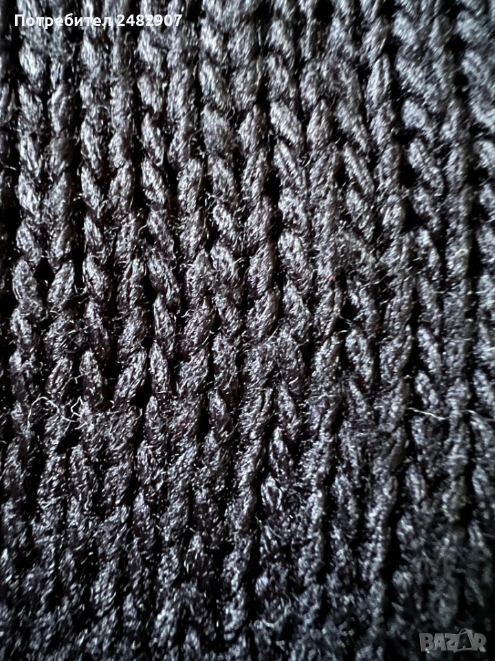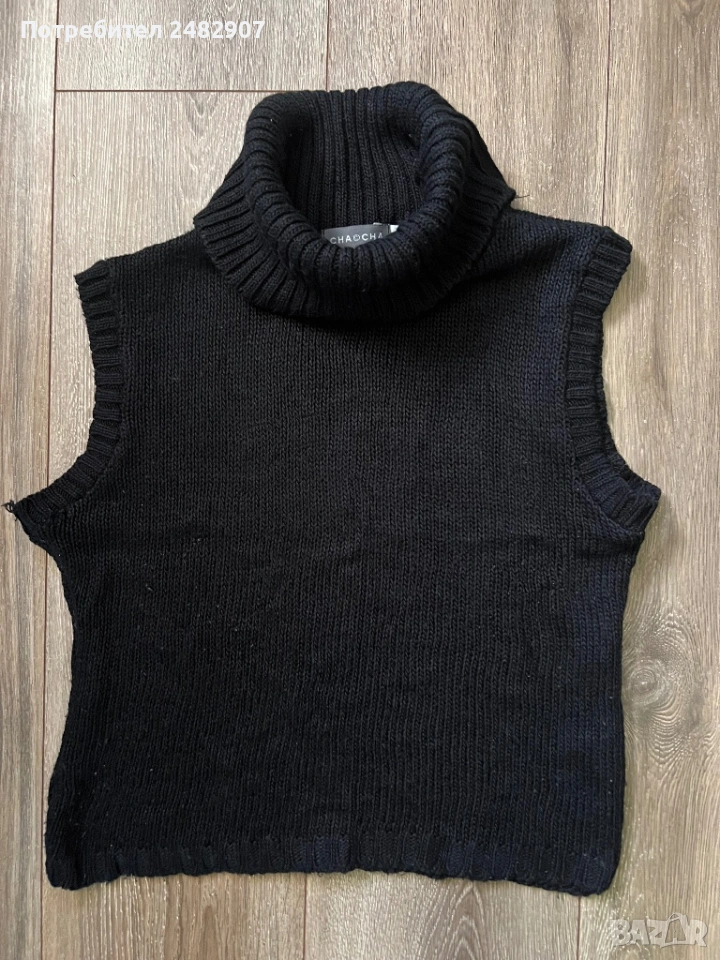 Машинно плетено черно дамско поло без ръкави, размер S. Съдържа 100 % акрил. Ширина в раменете - 40 см, ширина под мишниците - 47 см, ширина в долната част - 42 см, дължина от рамото до долу - 48 см, височина на полото - 20 см. Много запазено, почти не е използвано, разтегливо.