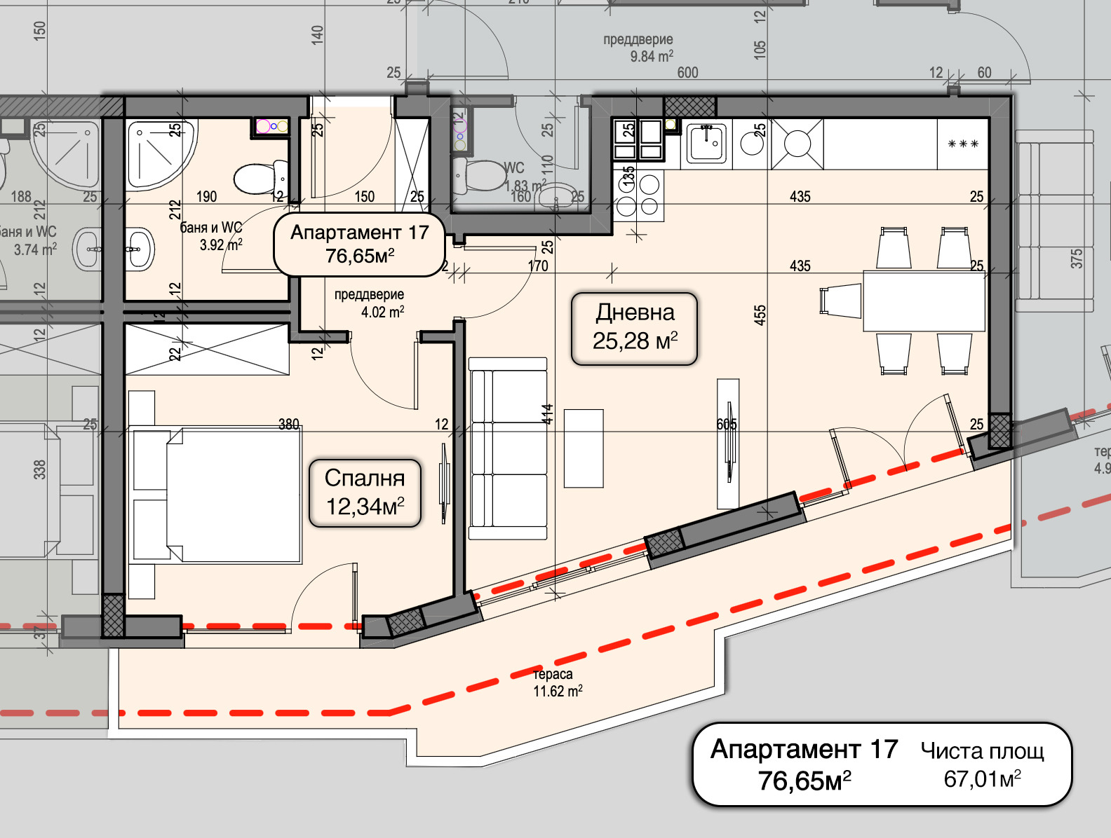 Апартаментът впечатлява с просторна дневна зона с правилна форма, позволяваща удобна организация на кухненска, трапезарна и холна част. Просторните спалня предлага комфорт и възможност за обособяване на гардеробна зона. Терасата е отлично допълнение за сутрешното Ви кафе или вечерна почивка.
