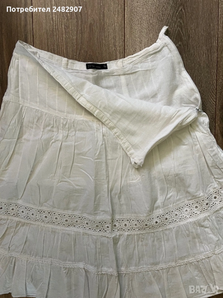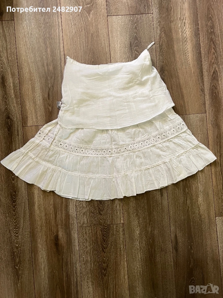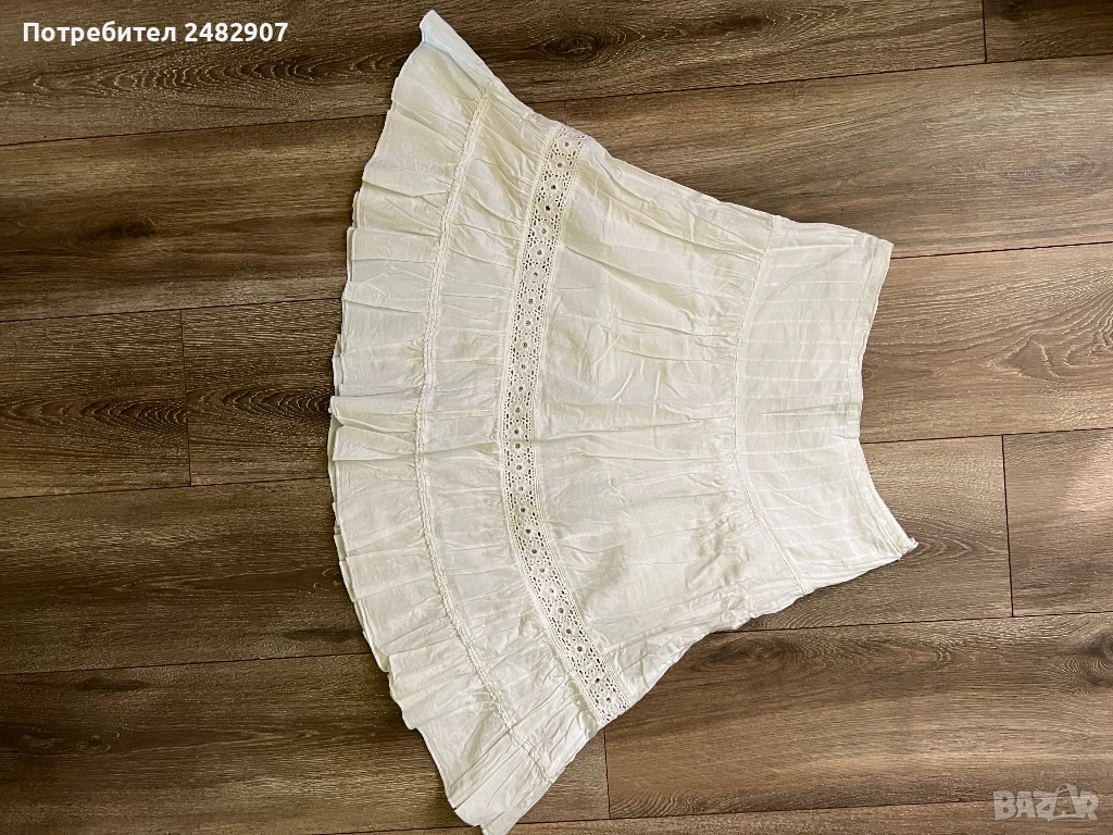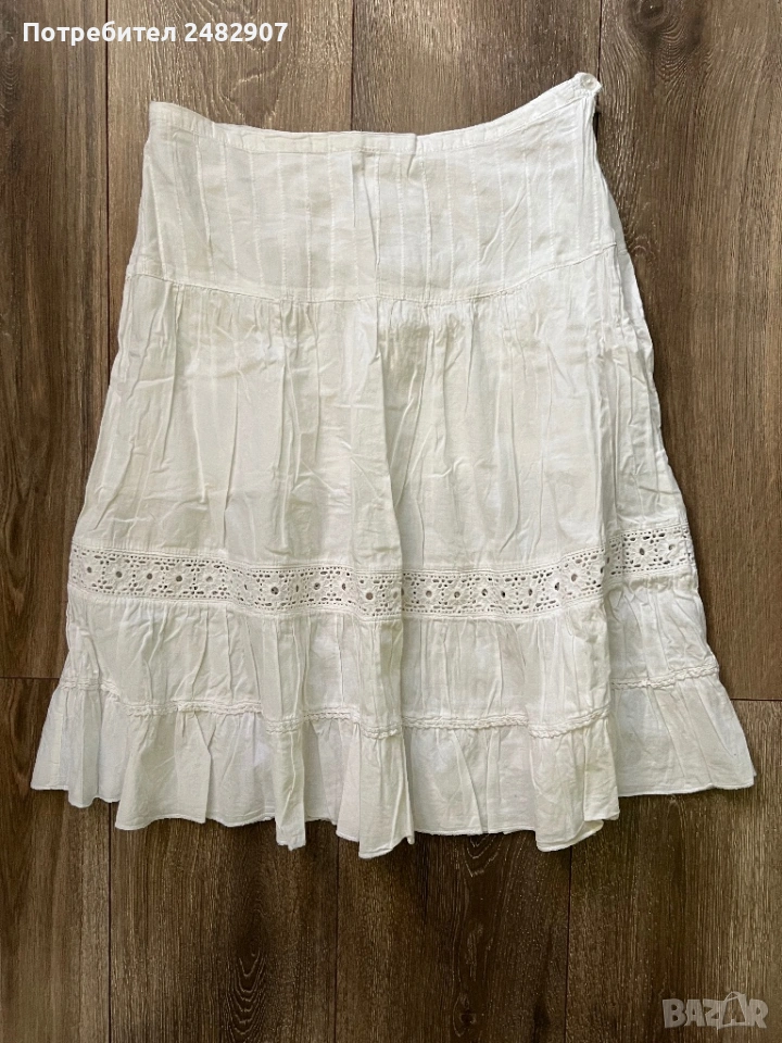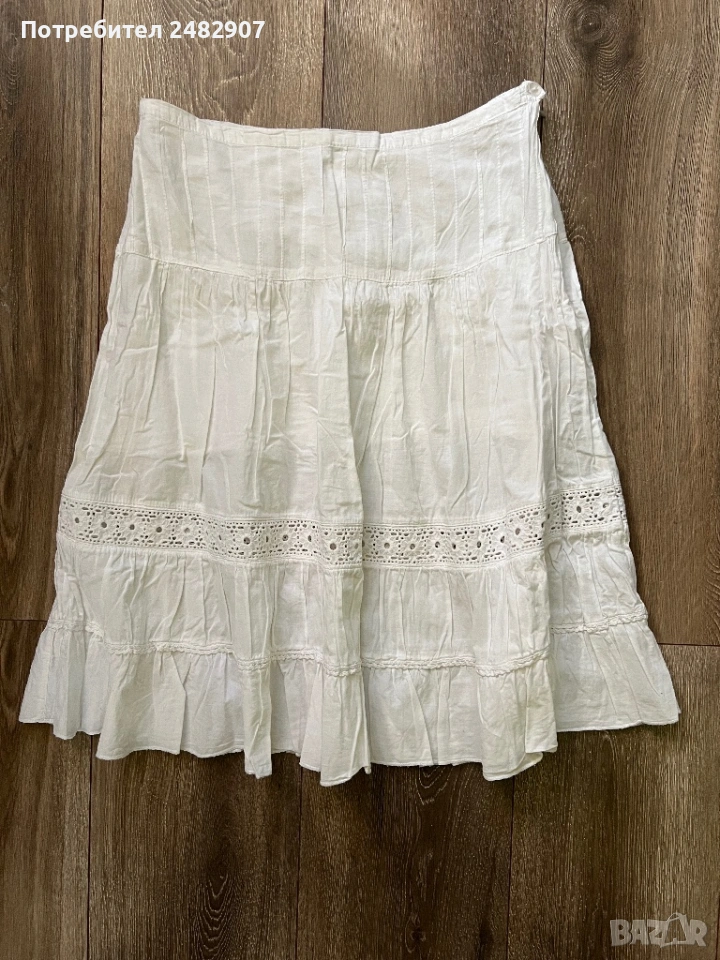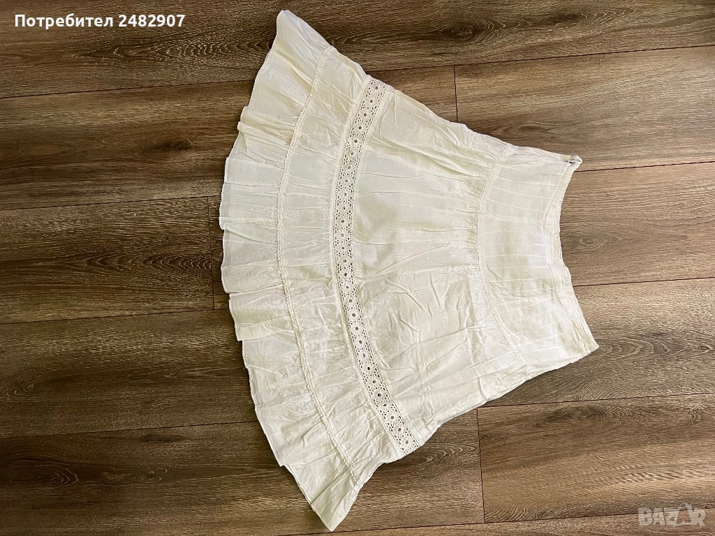Бяла дамска лятна пола с подплата, размер М. Съдържа 100 % памук. Ширина в талията - 36 см, ширина в долната част - 96 см, дължина от талията до долу - 56,5 см, дължина на подплатата - 30 см. Много запазена, почти не е използвана, закопчаване с копче и скрит английски цип отляво.