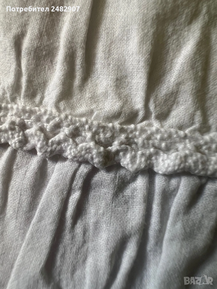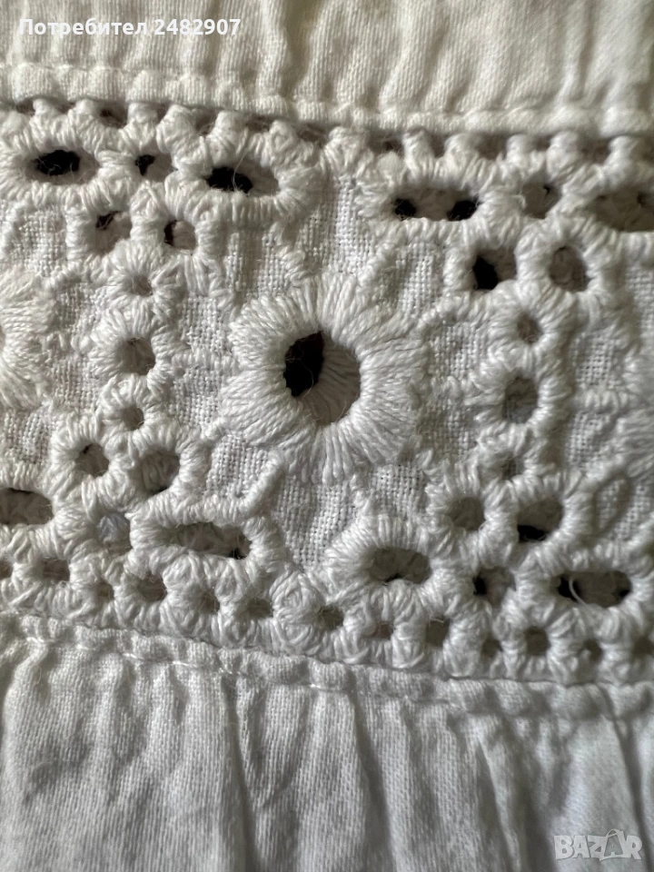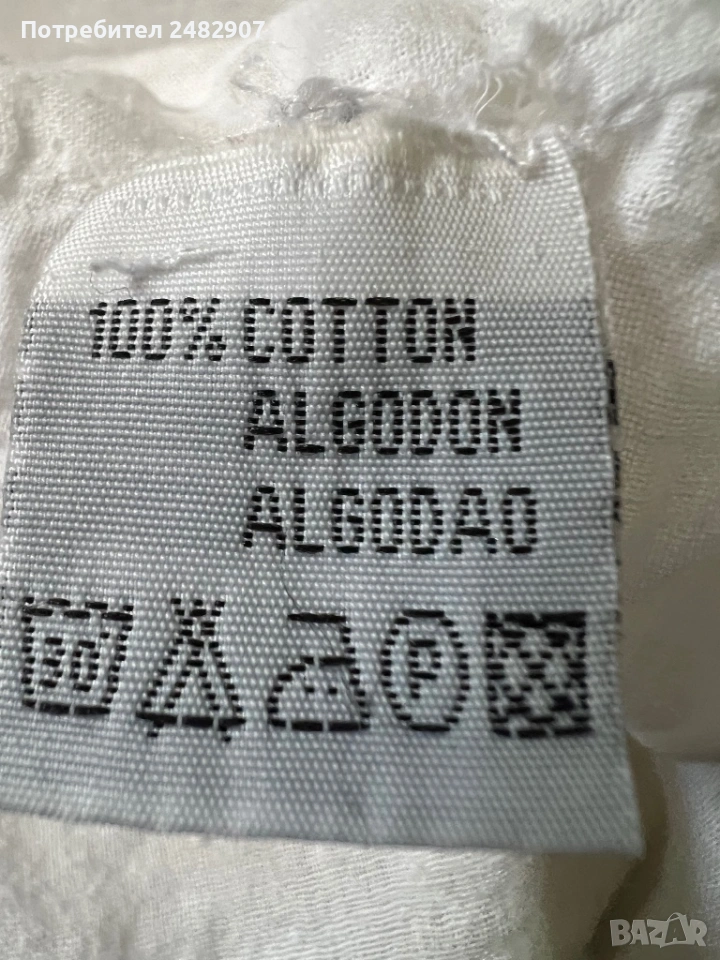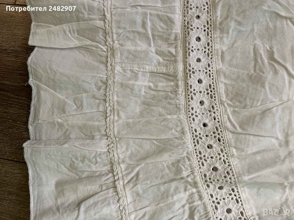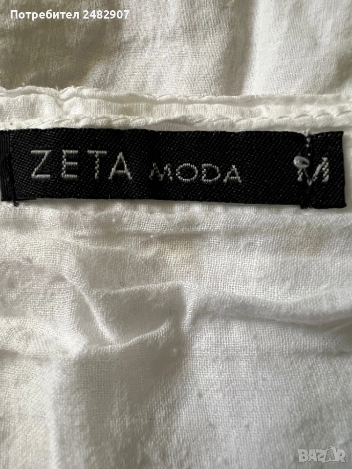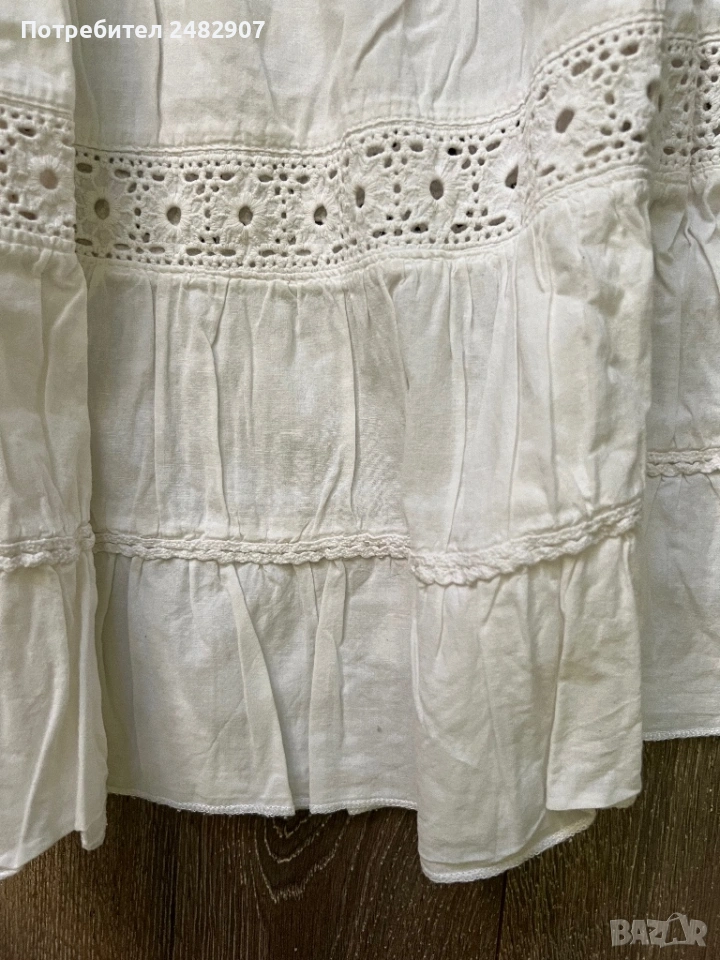 Бяла дамска лятна пола с подплата, размер М. Съдържа 100 % памук. Ширина в талията - 36 см, ширина в долната част - 96 см, дължина от талията до долу - 56,5 см, дължина на подплатата - 30 см. Много запазена, почти не е използвана, закопчаване с копче и скрит английски цип отляво.