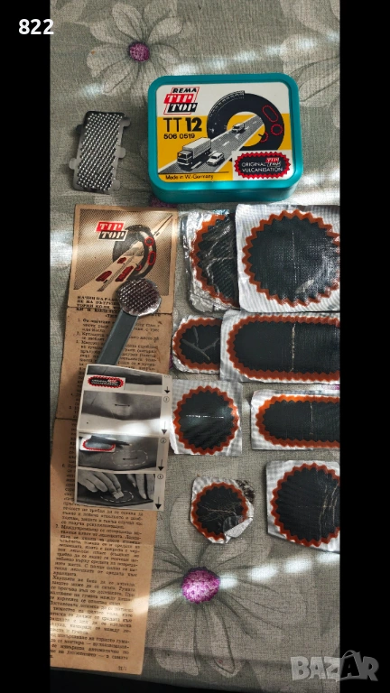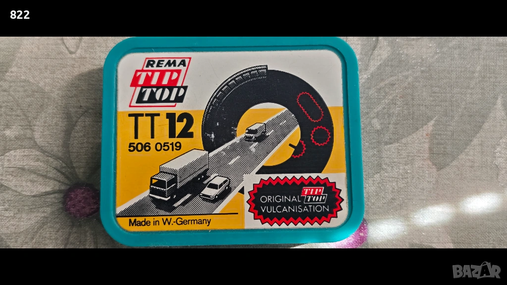 Ретро комплект за ремонт на вътрешни гуми:"Rema TIP TOP"TT12 West Germany произведен в Западна Германия през 80те години на м.в. арт.номер 506 0519 съдържа асортимент от лепенки с червено-оранжав ръб,които са по-здрави и подходящи за по-високо налягане.