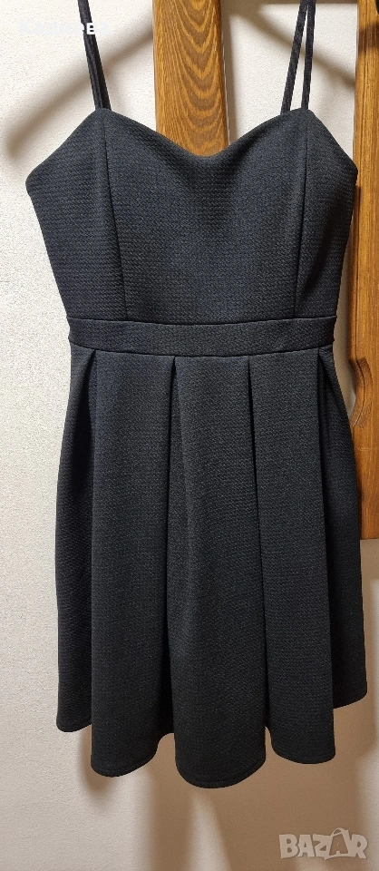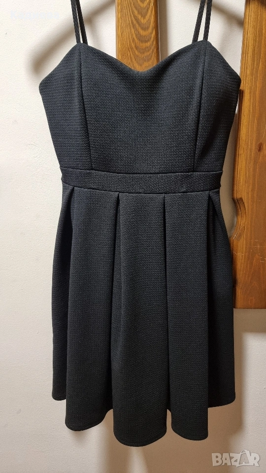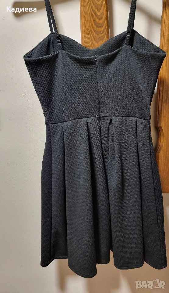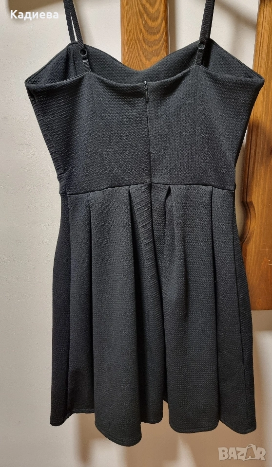 Черна мини рокля с втален силует и разкроена долна част. С много нежно деколте тип "сърце" и тънки презрамки, които се регулират. Има вградени подплънки . Закопчава се на гърба с цип.