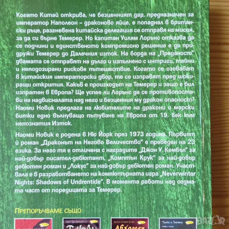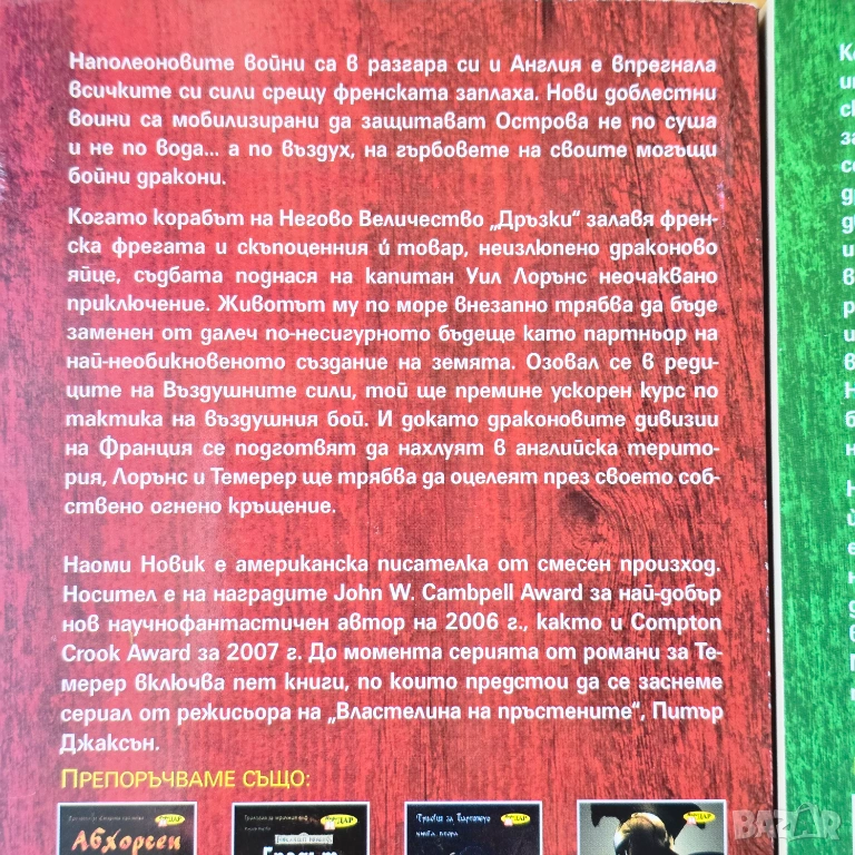 Какво би станало, ако по времето на Наполеон Бонапарт небесата са били бойно поле за огромни, интелигентни дракони? Наоми Новик създава един от най-обичаните фентъзи светове, в който честта, приятелството и стратегията се преплитат по невероятен начин.