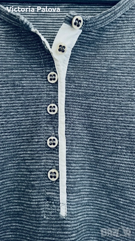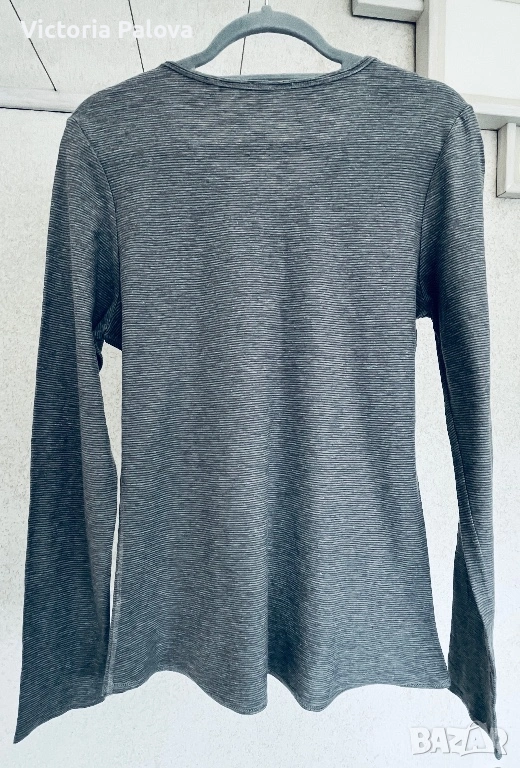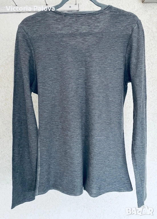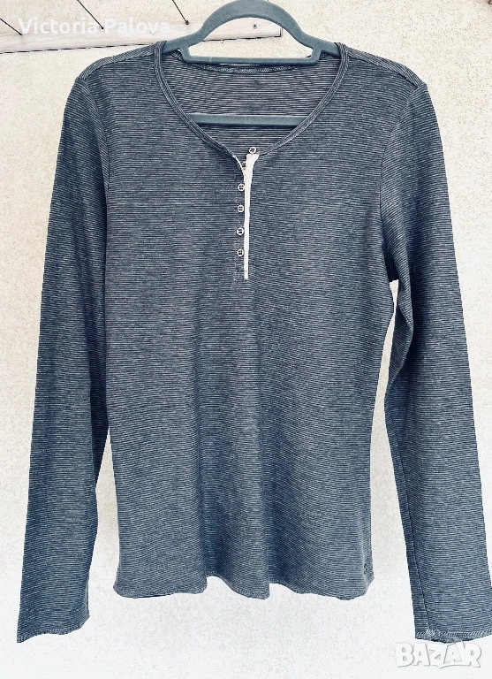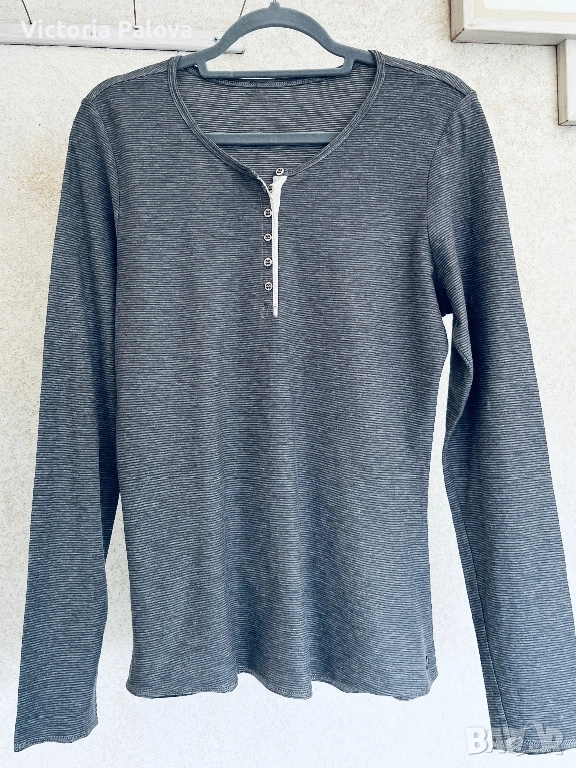 дамска блуза с дълъг ръкав на премиум марката Marc O'Polo. Моделът е в класически стил „хенли“ с характерното за него късо закопчаване с копчета под деколтето. Изработена е от изключително мека и приятна на допир материя ( памук) с дискретна текстура на фино райе и меланжиран ефект. Цветът е стилен антрацит, подчертан от контрастен светъл детайл при копчетата, който придава модерен вид на дрехата. Изключително удобен модел, идеален за ежедневието, който се съчетава отлично с дънки или спортно-елегантни панталони.